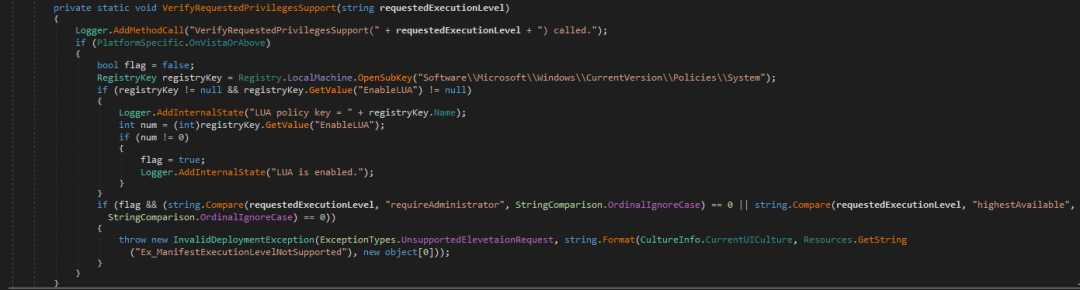 第二个必需条件是 UAC 设置不能是 requiredAdministrator 或 highestAvailable。System.Deployment DLL 的另一个检查是它会查看 UAC 设置,如果设置了不允许的值就会返回错误。