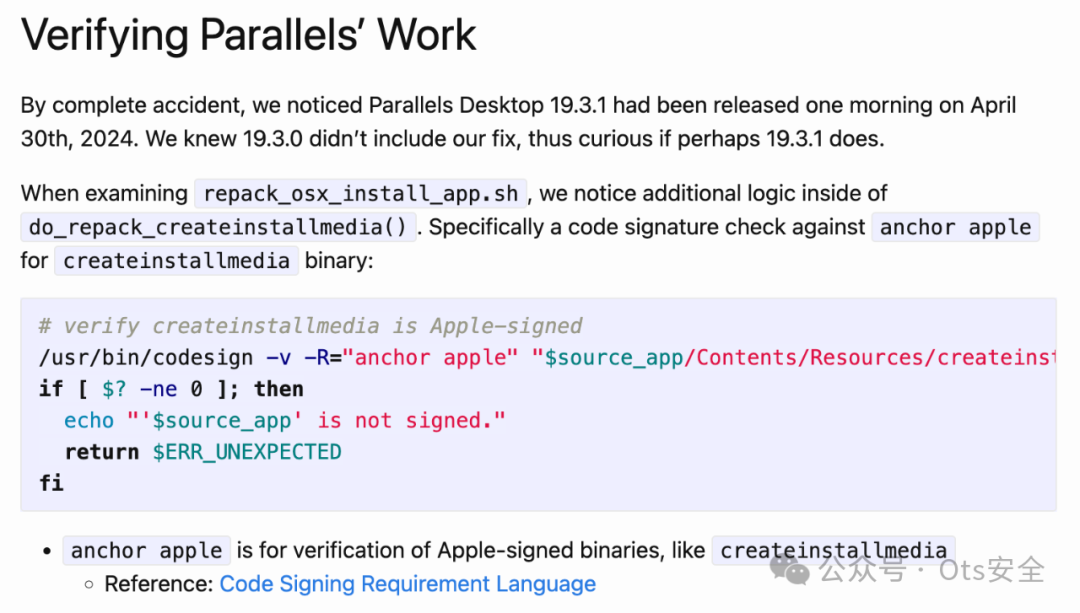 修补代码用于验证该工具是否createinstallmedia经过 Apple 签名。如果是,则将createinstallmedia以root 权限启动该工具。否则,它将以错误退出。