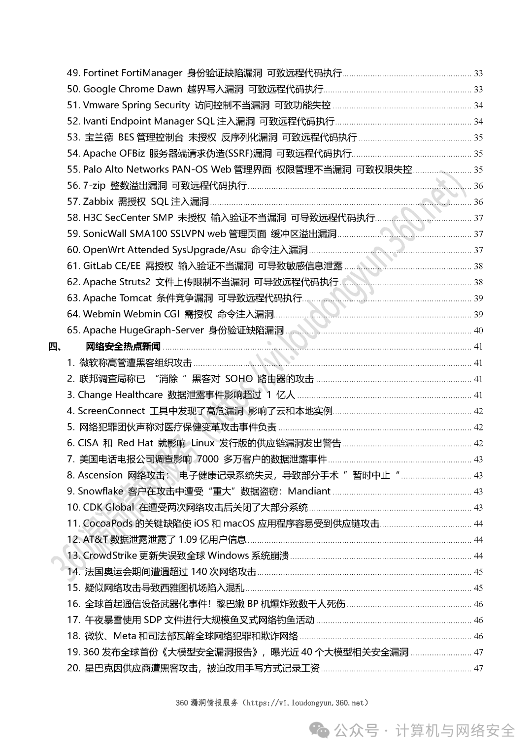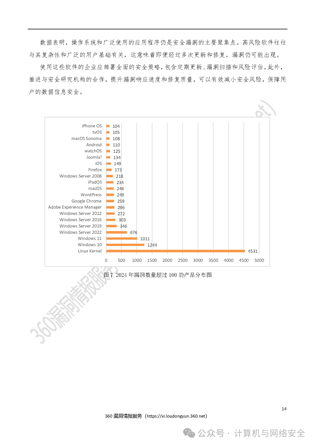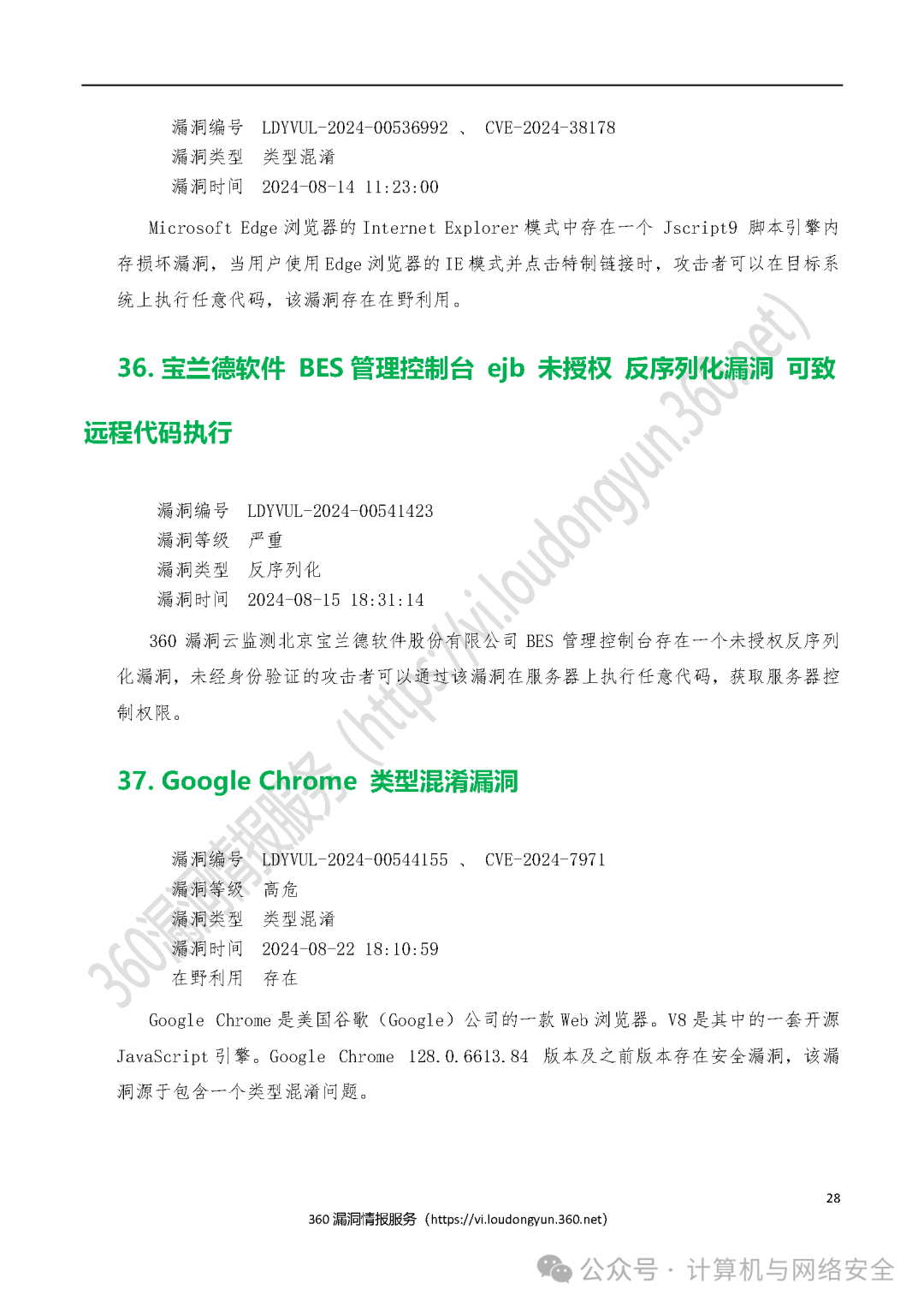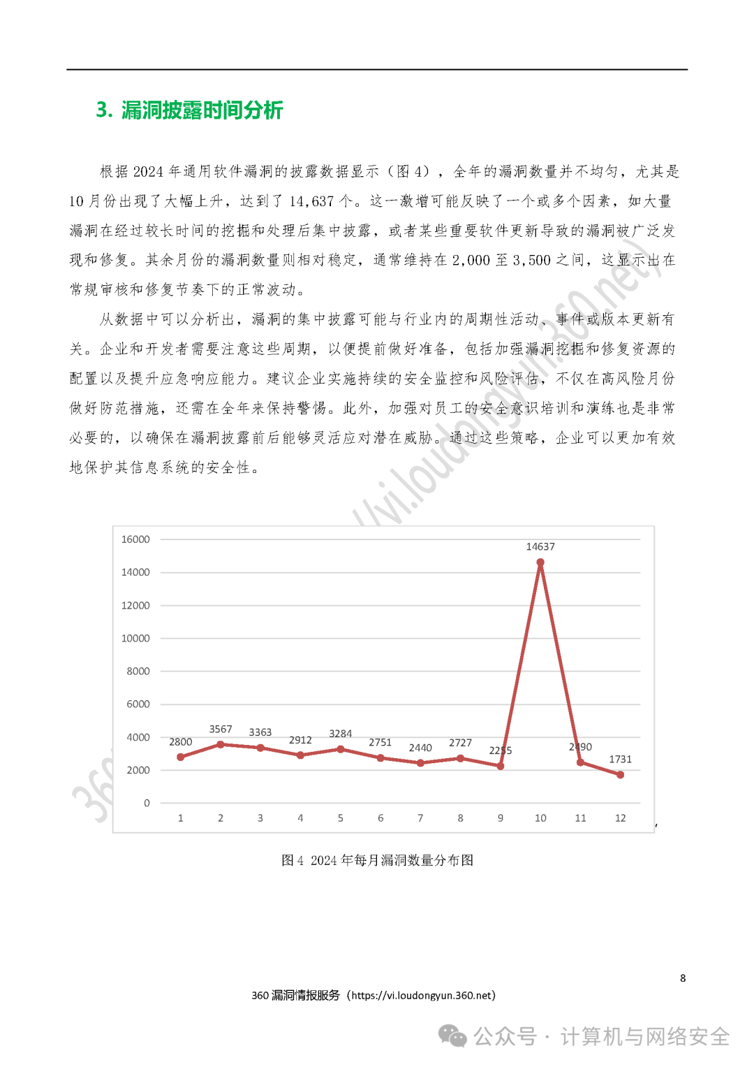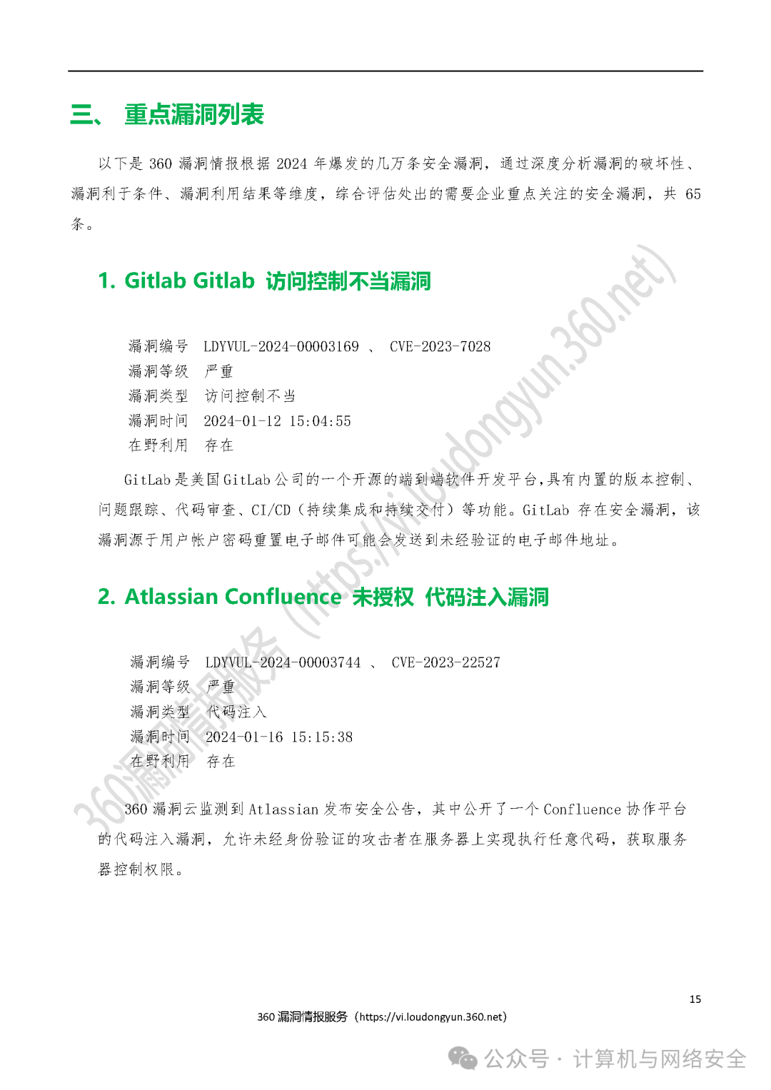 2024年,360漏洞情报团队基于安全大模型,结合使用广度、行业关注度、客户关注度、漏洞攻击复杂度和补丁发布情况等多维度指标对全年披露的漏洞进行综合研判分析,发布了超800条需要用户重点关注的漏洞情报,其中600条易被利用,300余条为需要尽快修复的高危漏洞,有效帮助企业、机构和相关从业者进行针对性安全防护。