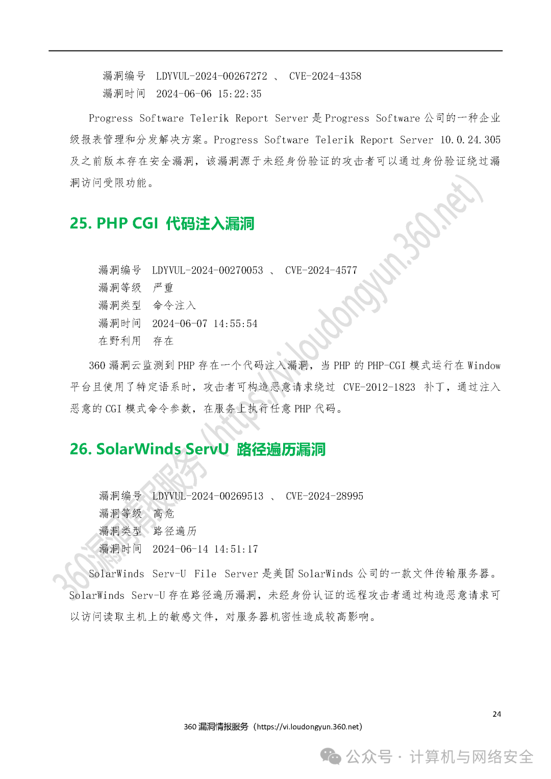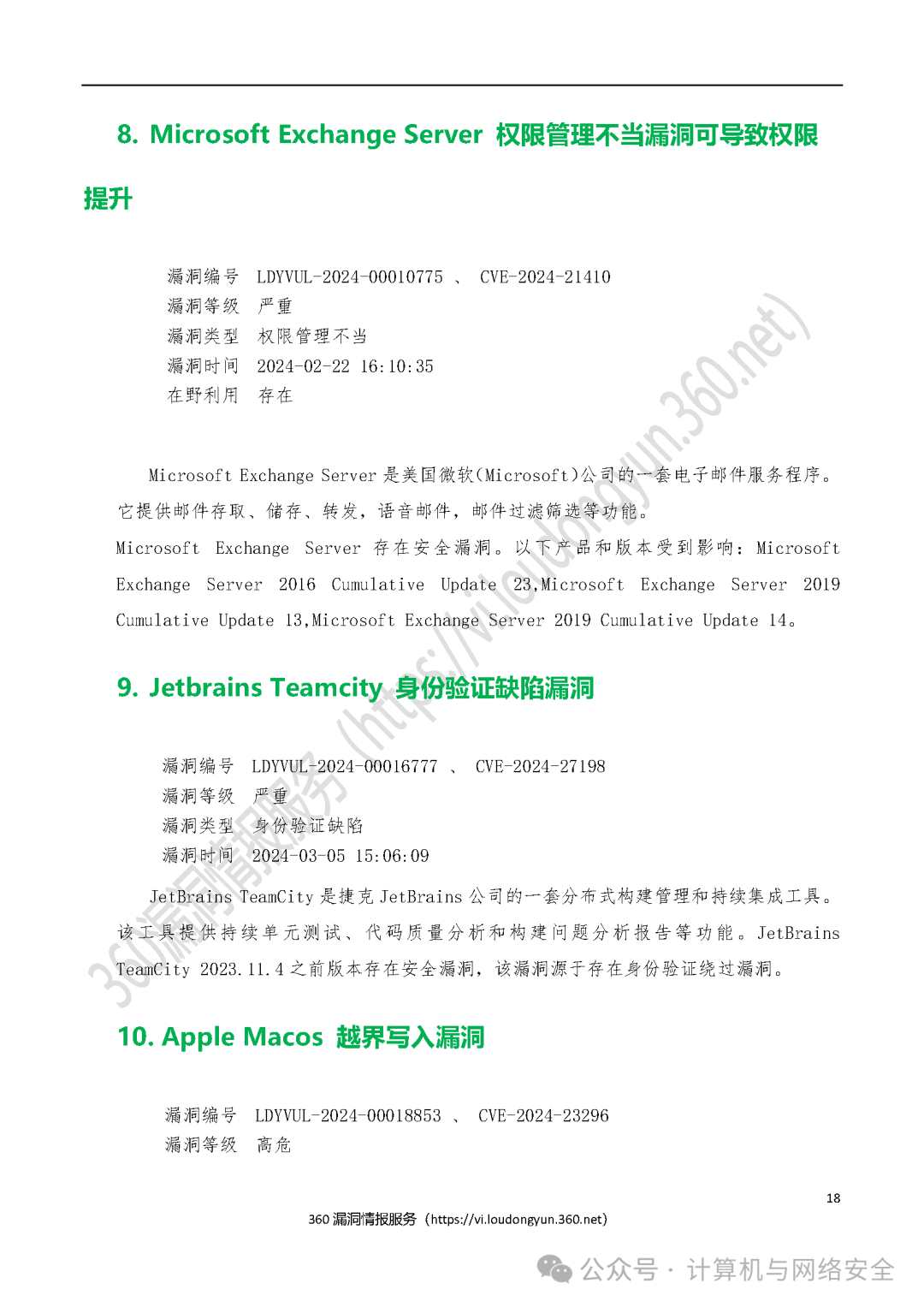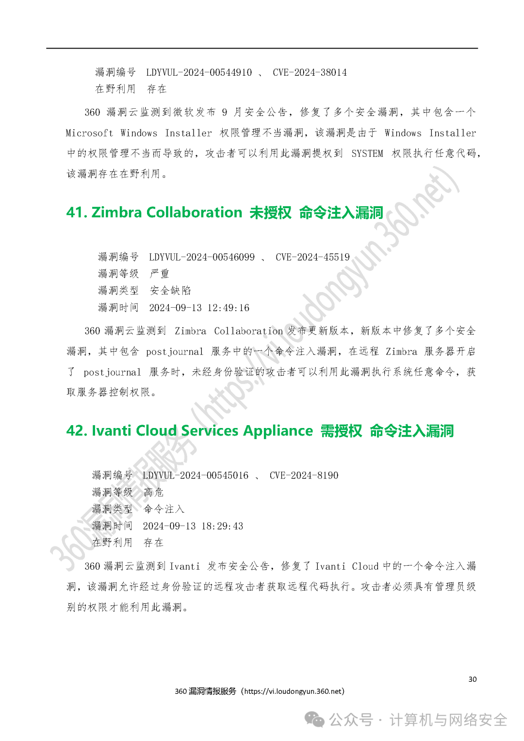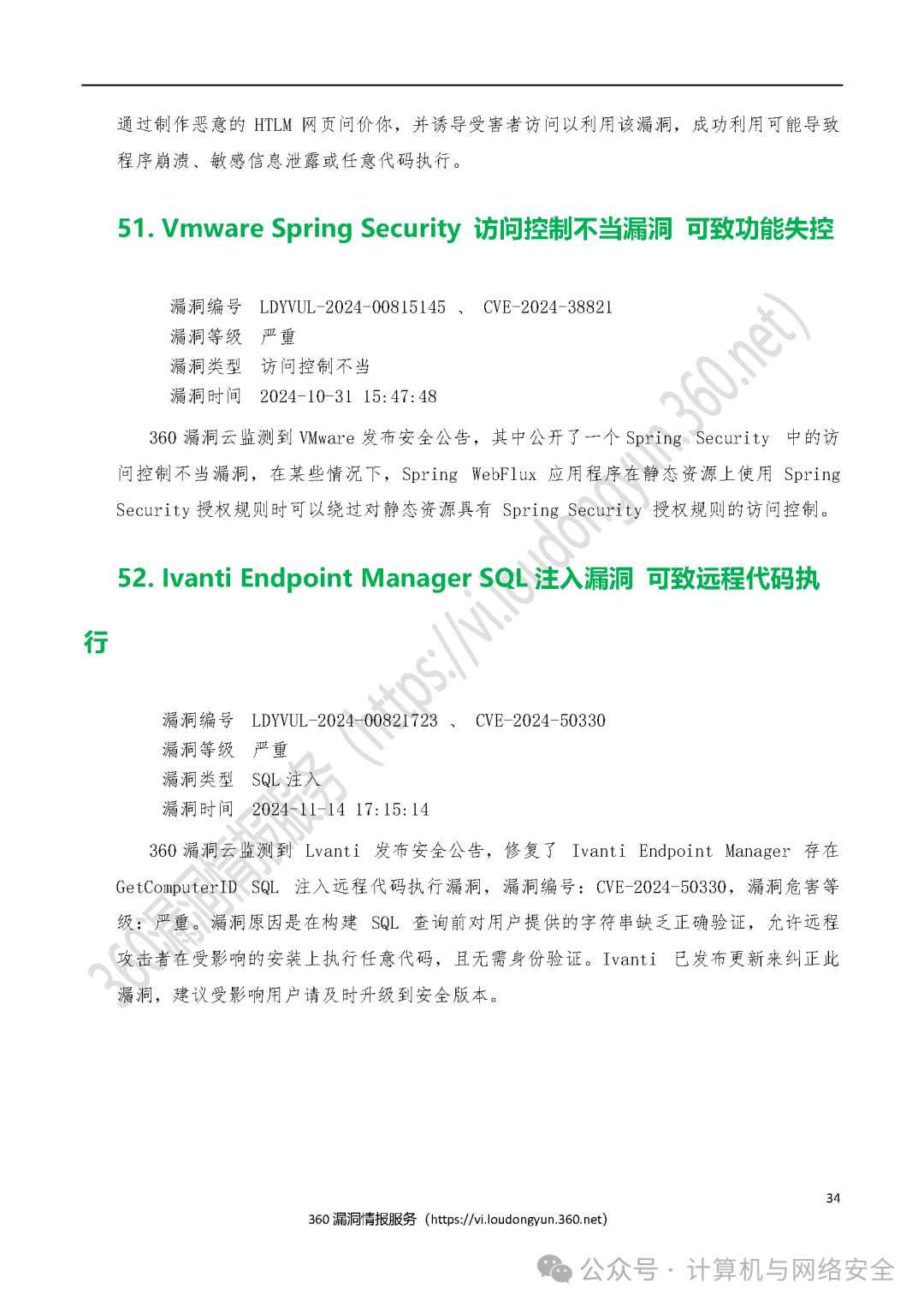 2024年,360漏洞情报团队基于安全大模型,结合使用广度、行业关注度、客户关注度、漏洞攻击复杂度和补丁发布情况等多维度指标对全年披露的漏洞进行综合研判分析,发布了超800条需要用户重点关注的漏洞情报,其中600条易被利用,300余条为需要尽快修复的高危漏洞,有效帮助企业、机构和相关从业者进行针对性安全防护。