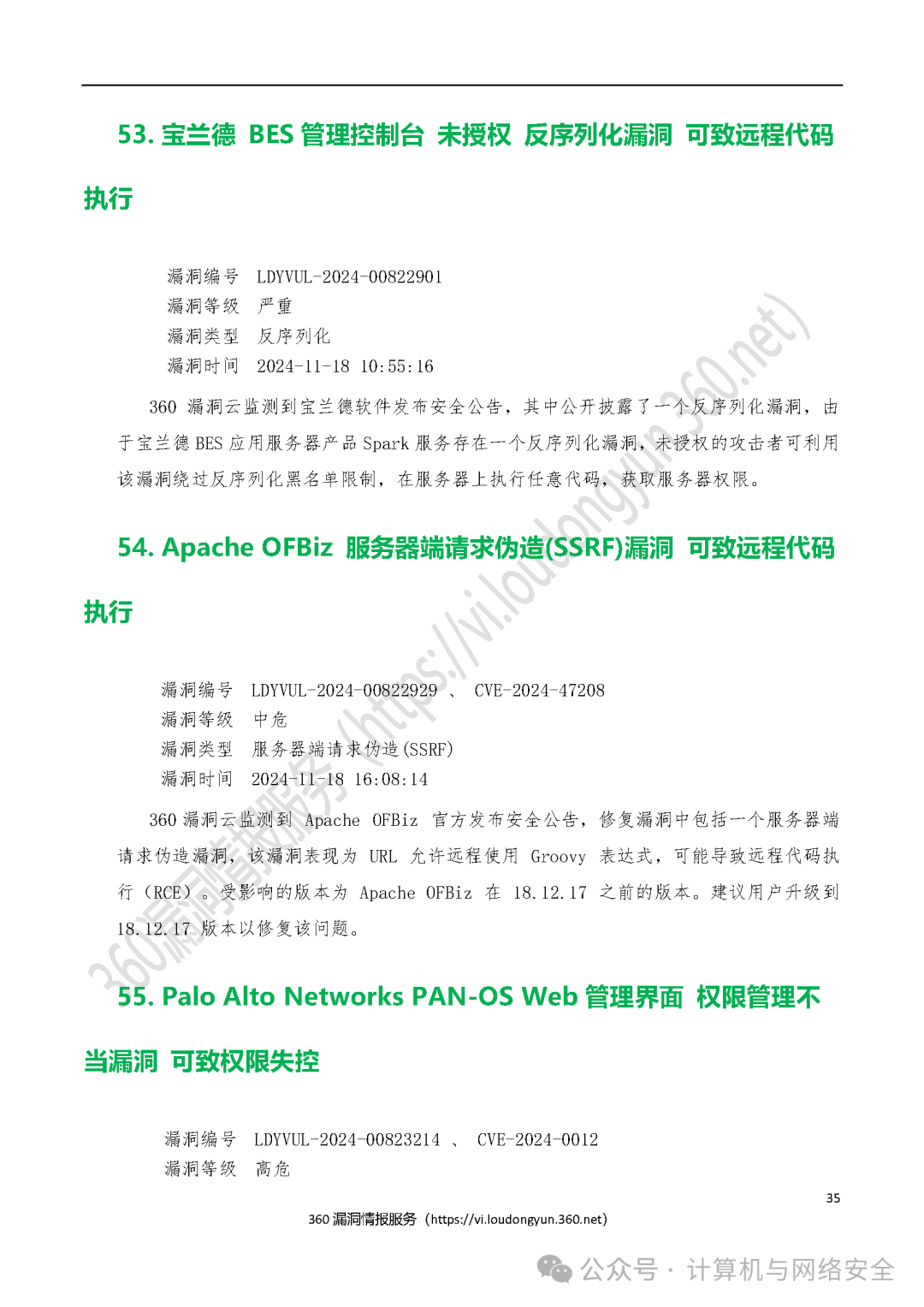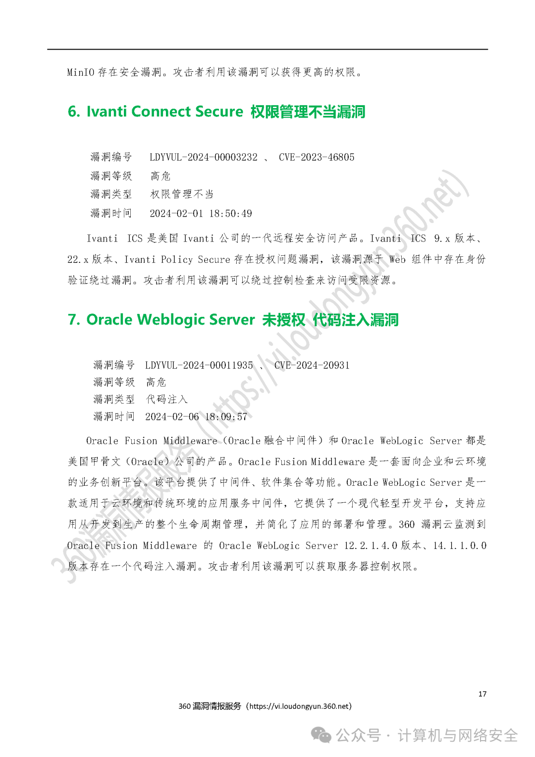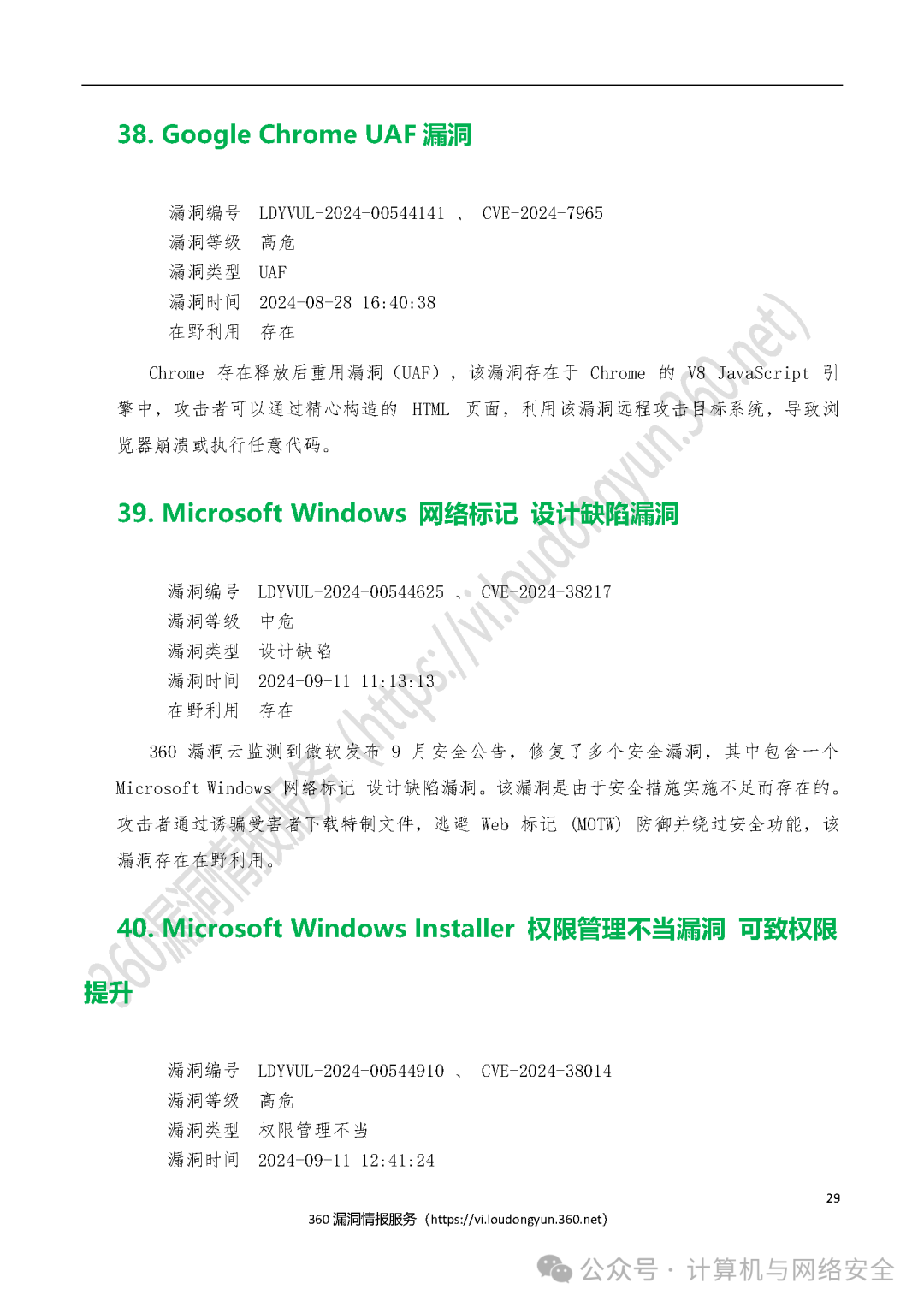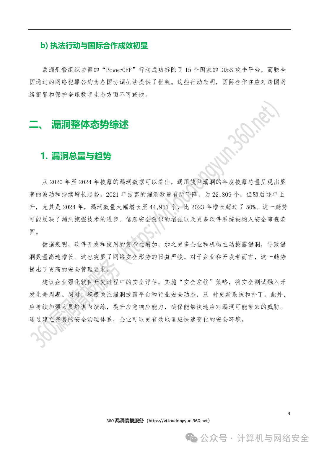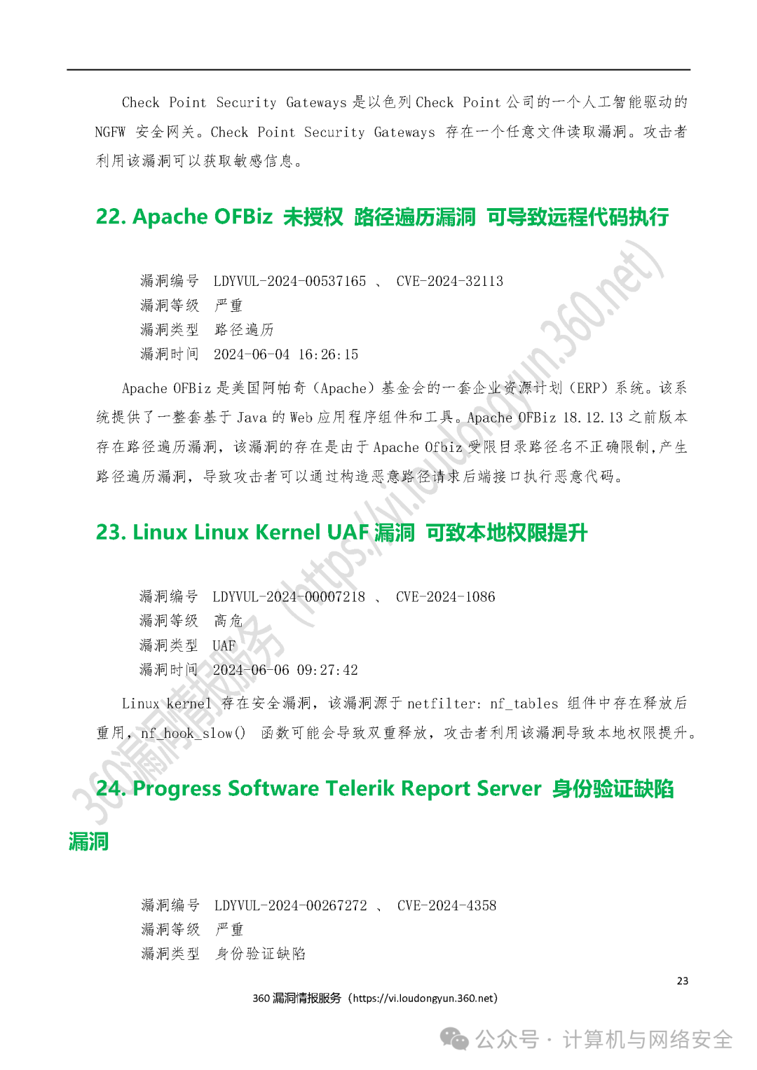 2024年,360漏洞情报团队基于安全大模型,结合使用广度、行业关注度、客户关注度、漏洞攻击复杂度和补丁发布情况等多维度指标对全年披露的漏洞进行综合研判分析,发布了超800条需要用户重点关注的漏洞情报,其中600条易被利用,300余条为需要尽快修复的高危漏洞,有效帮助企业、机构和相关从业者进行针对性安全防护。