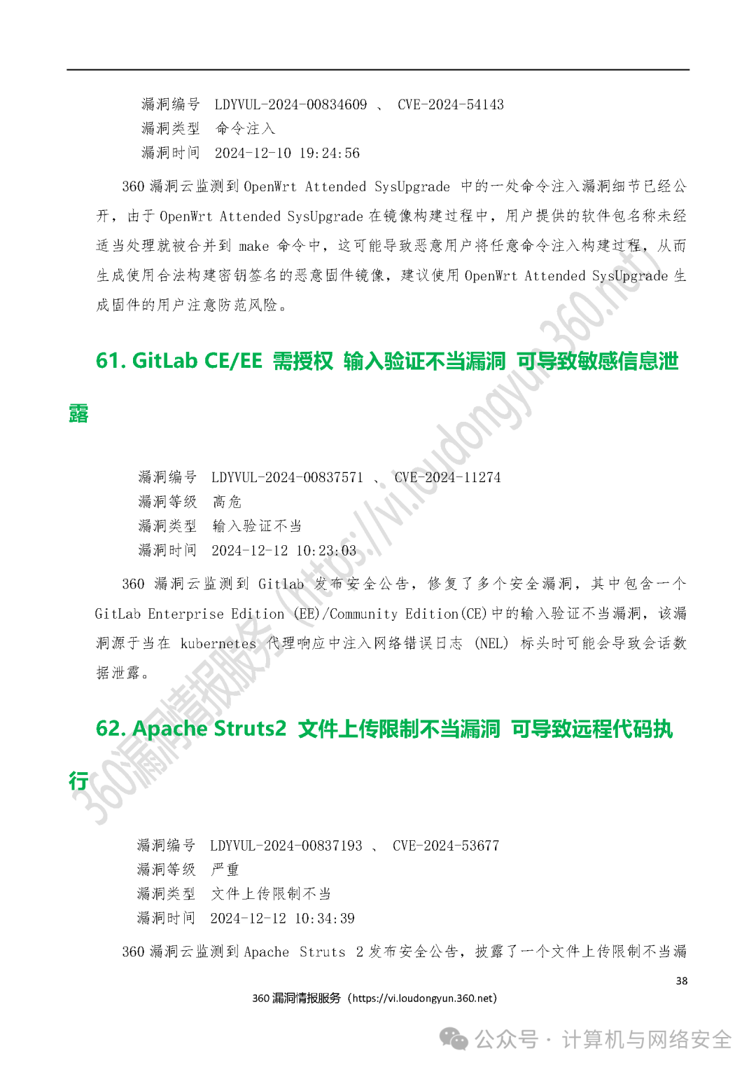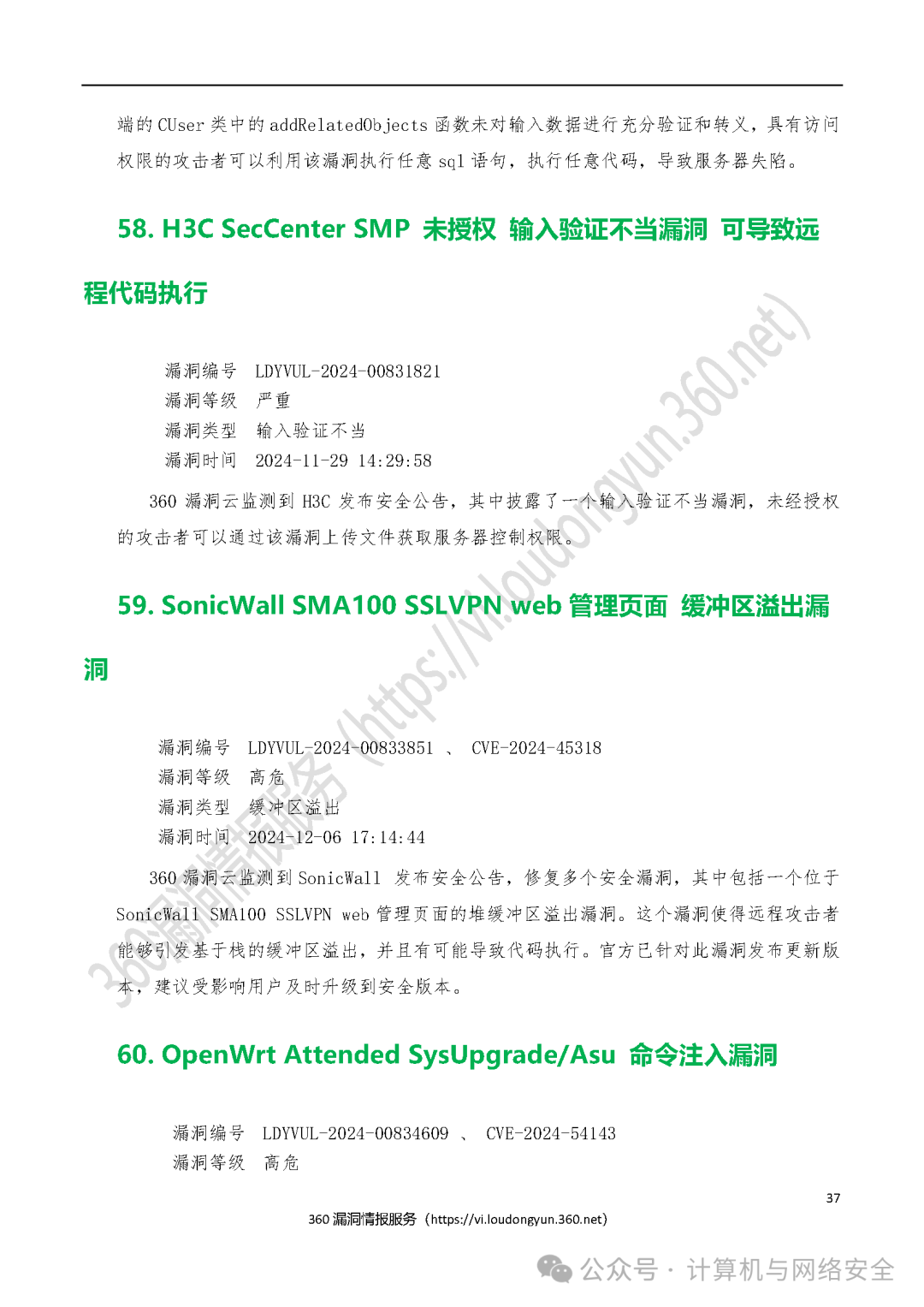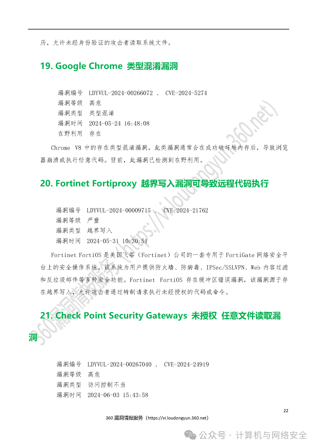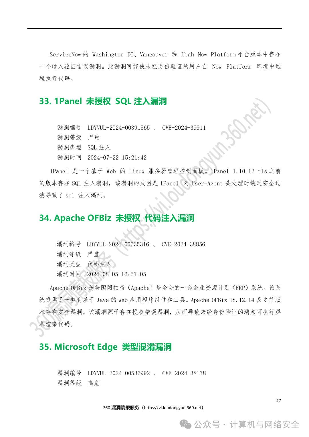 2024年,360漏洞情报团队基于安全大模型,结合使用广度、行业关注度、客户关注度、漏洞攻击复杂度和补丁发布情况等多维度指标对全年披露的漏洞进行综合研判分析,发布了超800条需要用户重点关注的漏洞情报,其中600条易被利用,300余条为需要尽快修复的高危漏洞,有效帮助企业、机构和相关从业者进行针对性安全防护。