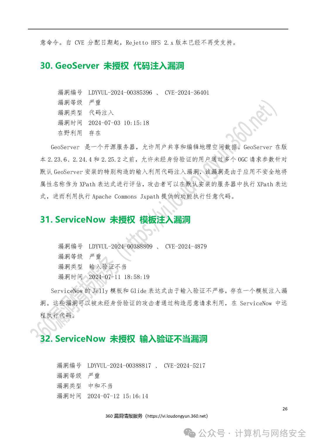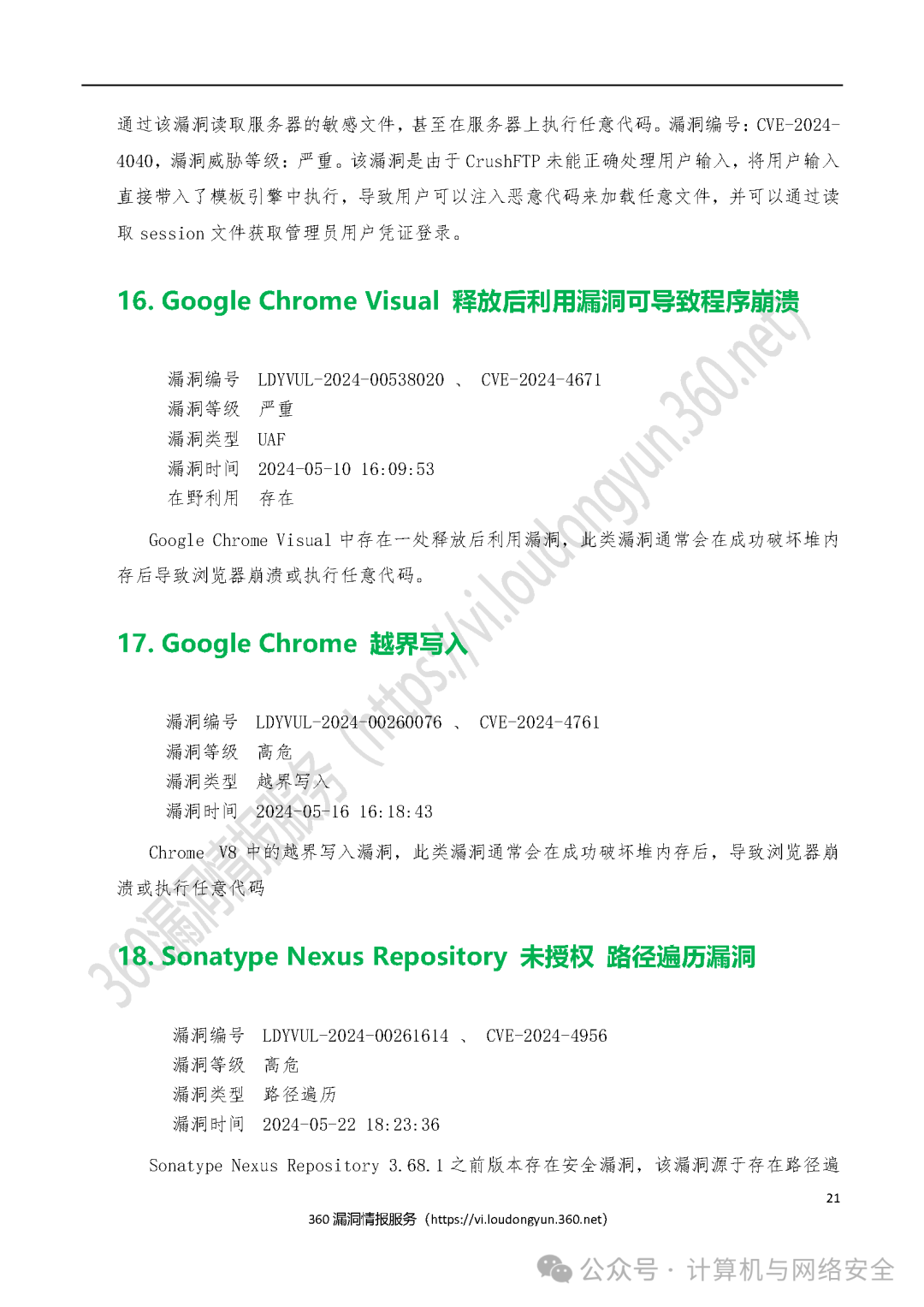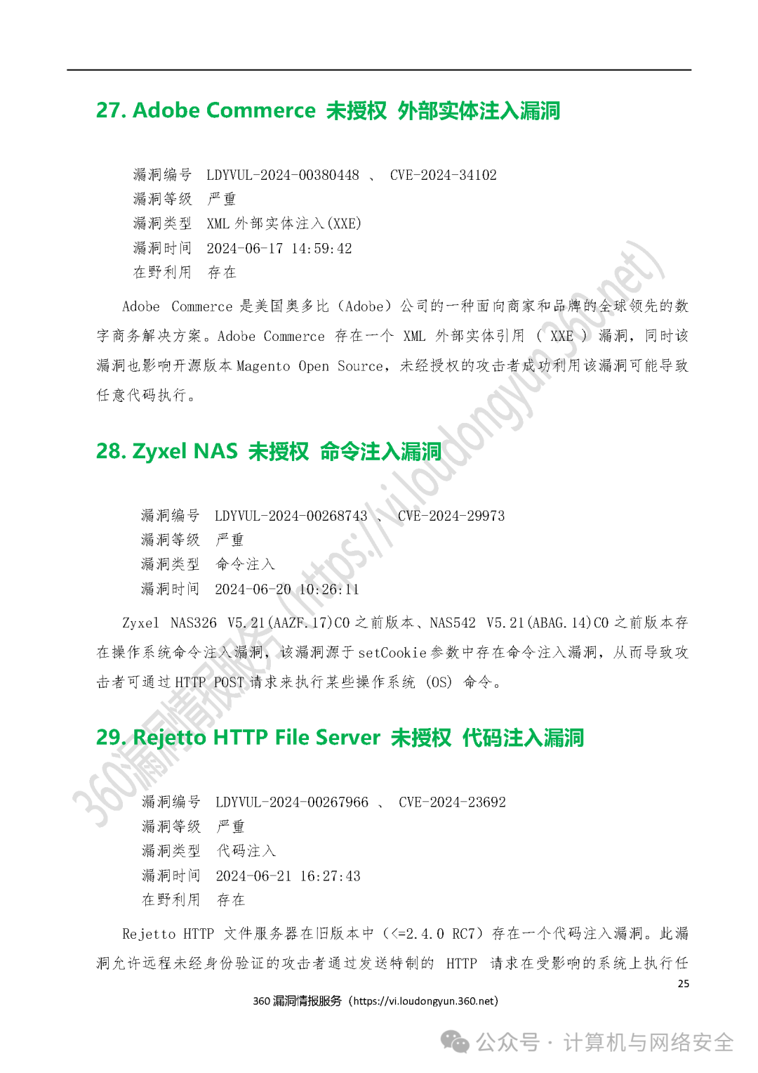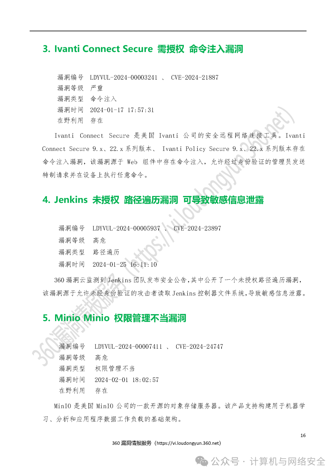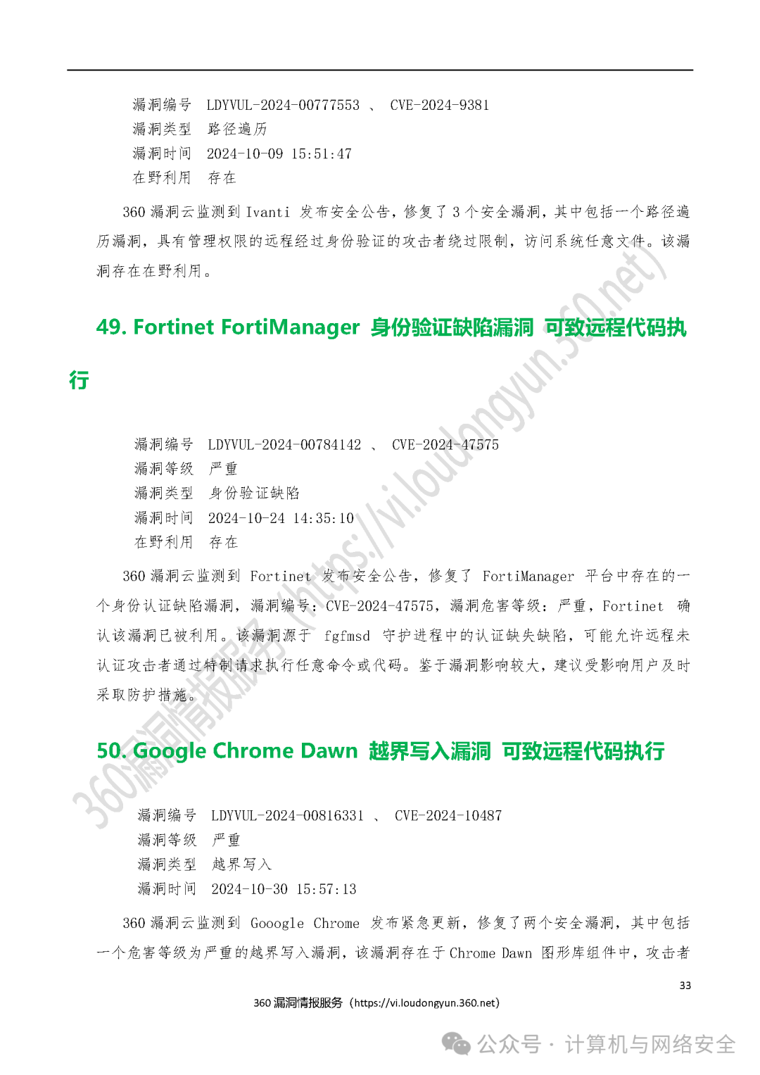 2024年,360漏洞情报团队基于安全大模型,结合使用广度、行业关注度、客户关注度、漏洞攻击复杂度和补丁发布情况等多维度指标对全年披露的漏洞进行综合研判分析,发布了超800条需要用户重点关注的漏洞情报,其中600条易被利用,300余条为需要尽快修复的高危漏洞,有效帮助企业、机构和相关从业者进行针对性安全防护。