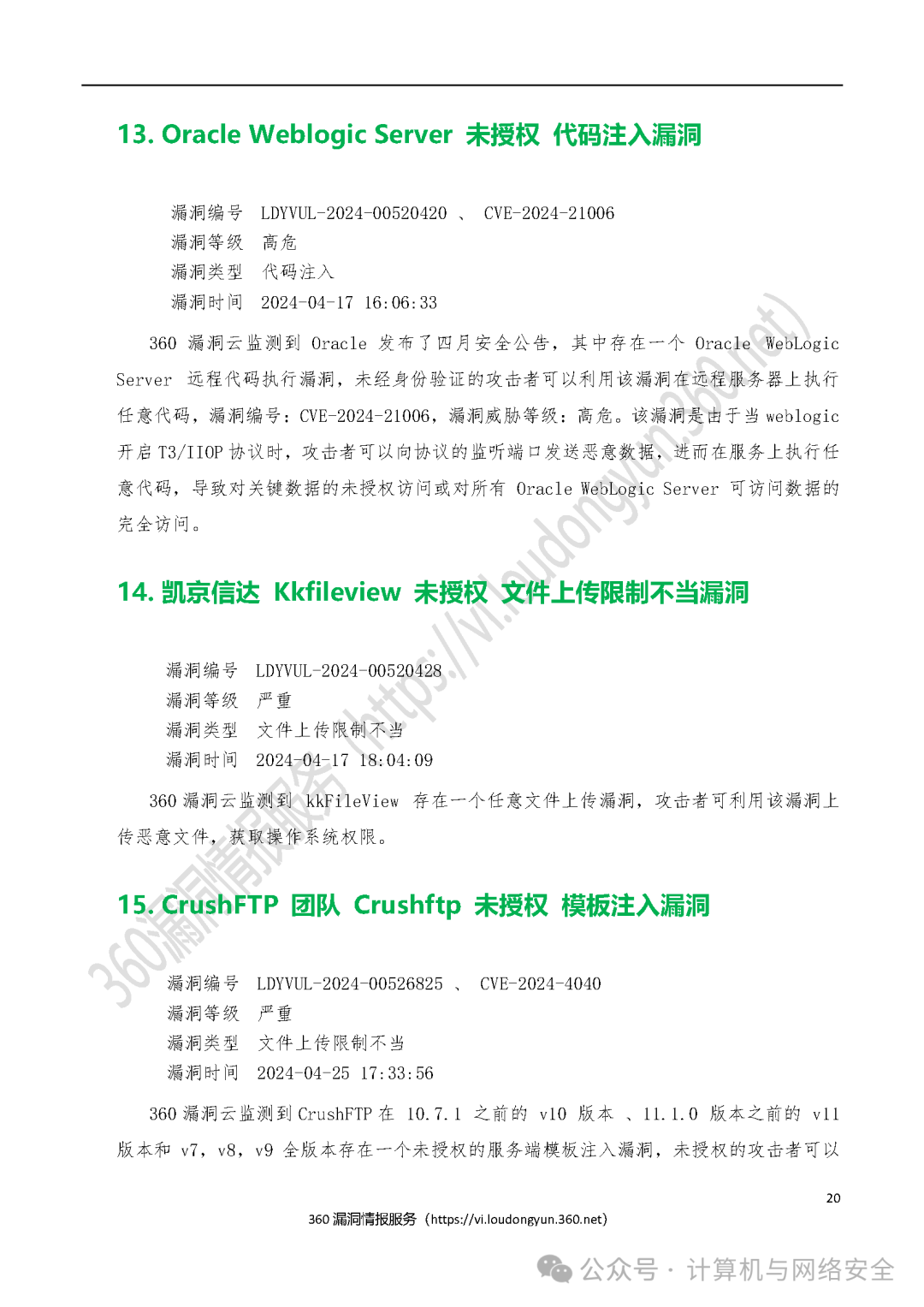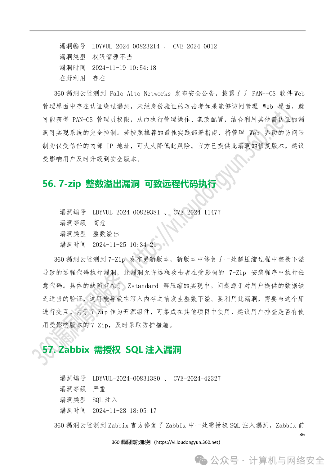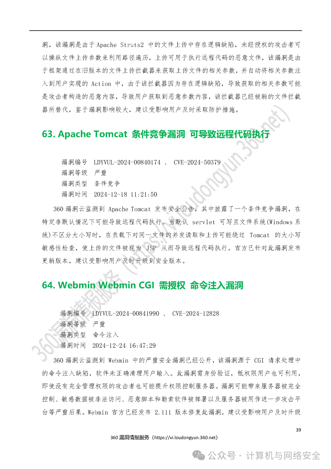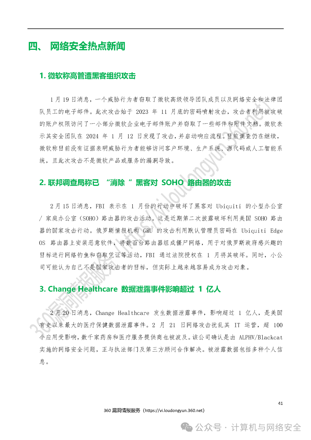 2024年,360漏洞情报团队基于安全大模型,结合使用广度、行业关注度、客户关注度、漏洞攻击复杂度和补丁发布情况等多维度指标对全年披露的漏洞进行综合研判分析,发布了超800条需要用户重点关注的漏洞情报,其中600条易被利用,300余条为需要尽快修复的高危漏洞,有效帮助企业、机构和相关从业者进行针对性安全防护。