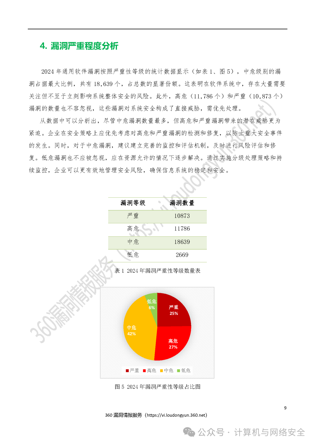 《报告》显示,2024年全球漏洞总数达到44,957个,相较于2023年增长超过50%,创下历史新高。这一趋势反映了软件开发和使用的复杂性在不断增加,漏洞的发现和披露周期也在缩短,全球企业在漏洞披露、修复的过程中,面临着更大的压力和挑战。2024年,高危和严重漏洞的占比超过50%,这些漏洞对系统的安全性构成了直接威胁,因此企业必须优先采取措施,确保系统的安全性得到及时保障。