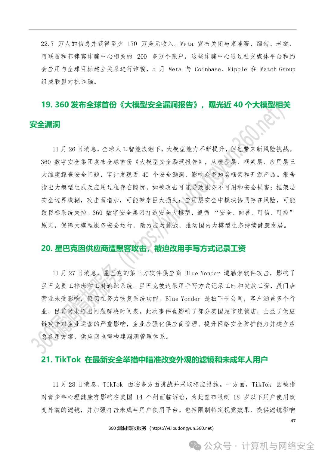 同时,人工智能技术发展迅速,也带来诸多风险挑战,2024年,360曝光了近40个大模型相关安全漏洞,影响范围覆盖llama.cpp、Dify等知名模型服务框架,以及Intel等国际厂商开发的多款开源产品,敲响人工智能安全警钟。