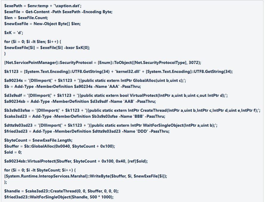 随后,恶意的BAT脚本调用另一个PowerShell脚本,以解密RokRat Shellcode并在内存中加载执行。