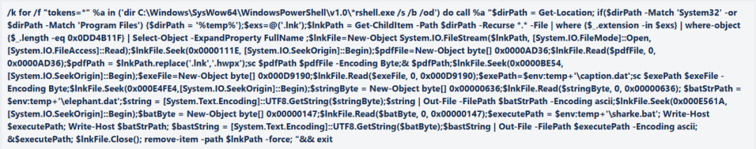 恶意的LNK文件通过调用PowerShell,从自身嵌入的数据中提取多个文件。这些文件包括诱饵文档、恶意的BAT脚本、恶意的PowerShell脚本以及加密的RokRat Shellcode。