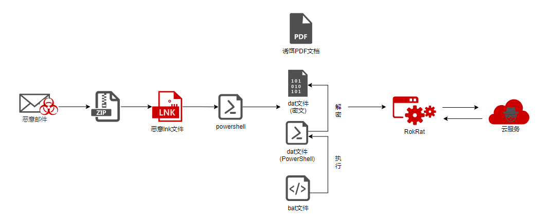 攻击者首先从一些合法的官方网站收集目标用户感兴趣的信息,以此制作高度定制化的钓鱼邮件,并将其发送给目标。这些钓鱼邮件的附件压缩包内嵌入了恶意LNK文件。一旦目标用户点击并激活该恶意LNK文件,它会释放多个文件,其中包括加密的RokRat Shellcode。随后,攻击者利用XOR算法对加密载荷进行解密,接着,这个Shellcode在一个新创建的线程中被加载,内部进一步解密硬编码的数据,最终获取并执行RokRat恶意软件。