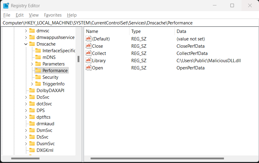 通过在 DnsCache 服务 Registry 键下注册子键,如下例所示,我们已成功映射了 Performance Counter。