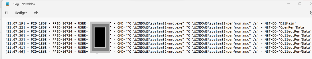 一旦 Registry 键被映射且 DLL 位于磁盘上(或理论上位于网络可达的某个位置),就到了启动并期待成功的时候了。现在请记住我之前提到过 Perfmon.exe 作为 Performance Counter Consumer,通过 Explorer 启动 Perfmon.exe 实用程序,在下面截图中显示的界面中,我们可以看到我们的日志记录功能的执行。