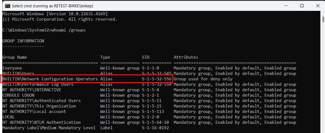 从截图中可以清楚地看到,恶意 DLL 已在 SYSTEM\安全上下文中执行。这是本博客中的最终证明,确认了在 2025 年 1 月 14 日通过引入 1 月安全更新修复 “Network Configuration Operators” 组之前,在特定条件下成功突破系统完整性的可能性。