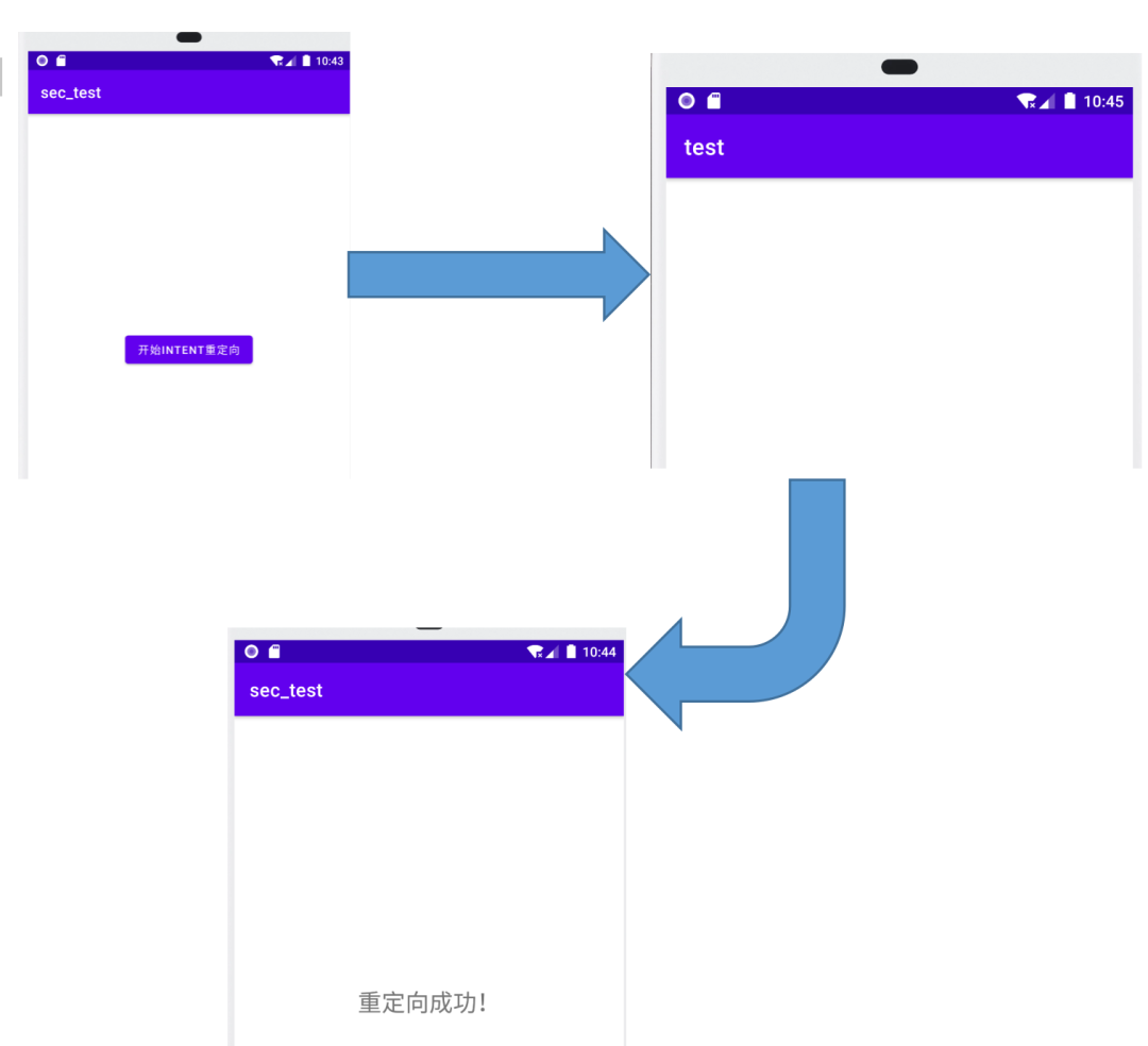 整个过程如下图,实际看到的是,点击按钮后直接跳转到”重定向成功“界面,但中间会有一个空白界面就是我们的Activity1:
