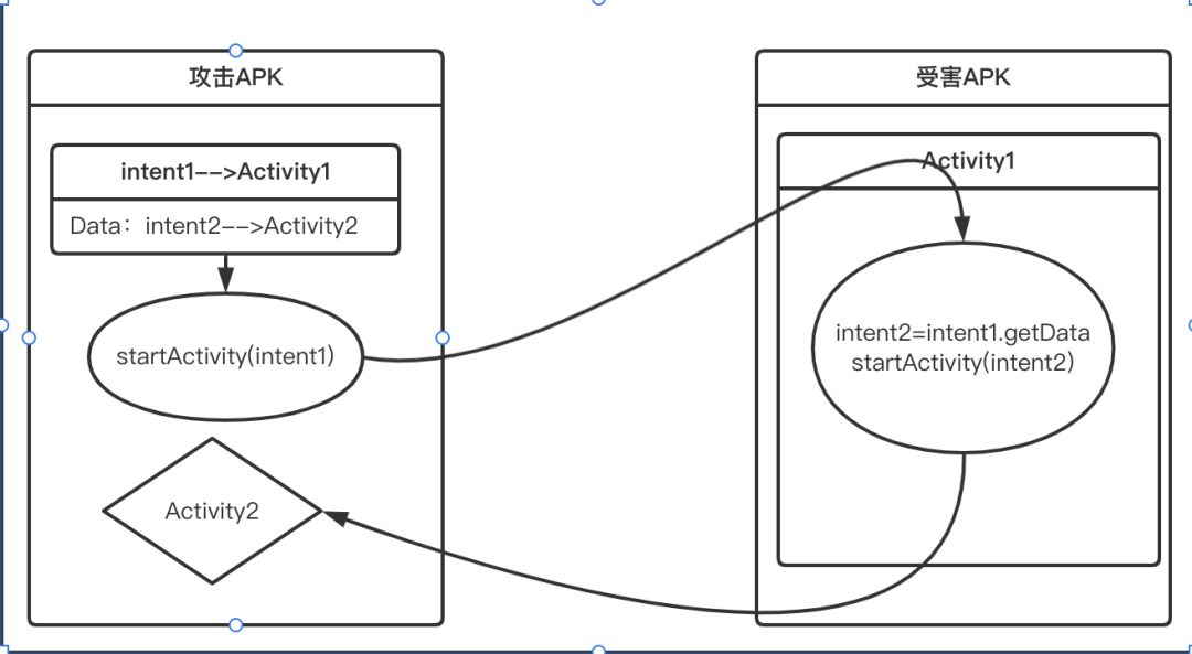 简单介绍了Intent之后,我们来了解一下什么是重定向,其实它就是一个双层嵌套,根据下图理解,攻击Apk使用startActivity(intent1)进入受害apk的Activity1,Activity1中会接收一个intent(称intent2,这个intent2指向攻击Apk中的Activity2)类型的数据,对这个intent2使用startActivity(intent2),这样最终就进入了Activity2。