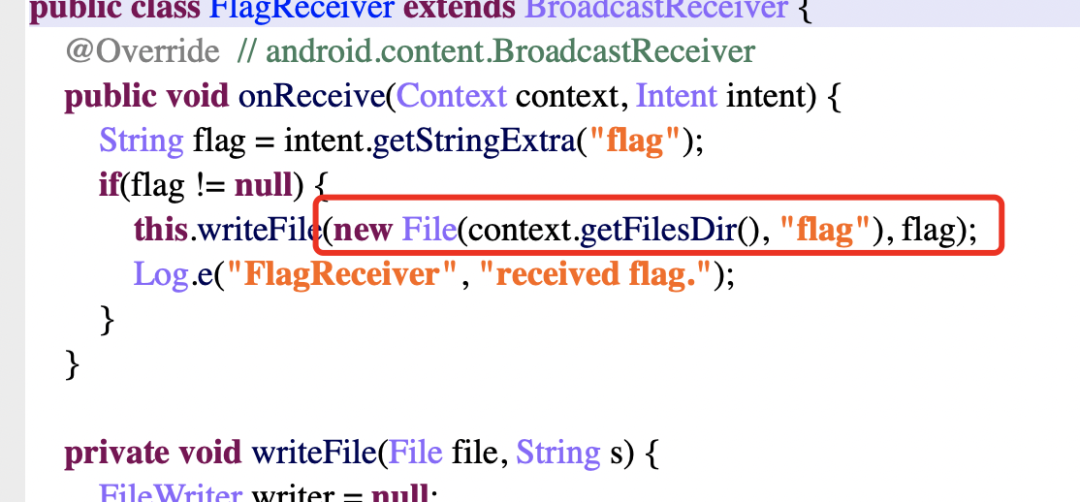 MainActivity是空的,没什么用,FlagReciver是一个广播接收器,经分析是设置flag的,将接收的flag写入文件,这应该和做题的人关系不大。
