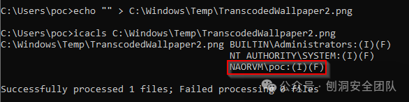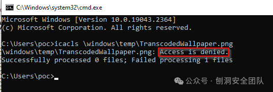 问题(其实不是,我稍后会解释) – 源文件被复制到 C:\Windows\Temp\,这意味着最终文件将由 NT AUTHORITY\SYSTEM 拥有,并且由于 C:\Windows\Temp 默认情况下对低权限用户没有读取权限,最终文件名将继承 DACL,并且仅允许 NT AUTHORITY\SYSTEM 和 Administrators 组读取。