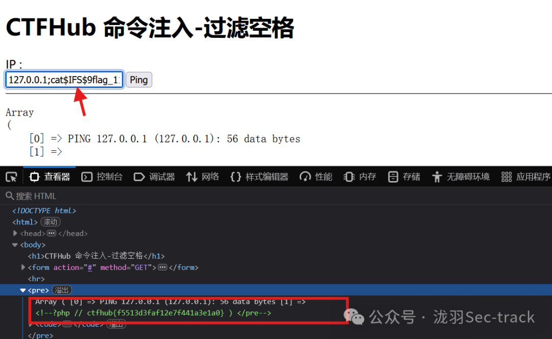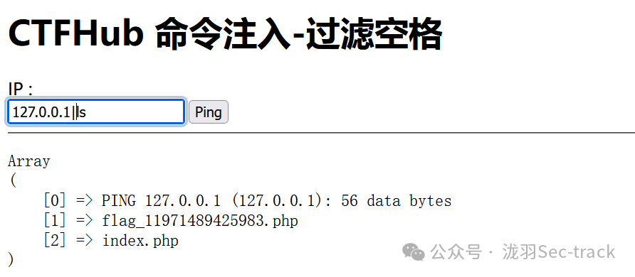 if (!preg_match_all("/(\||&|;| |\/|cat|flag|ctfhub)/", $ip, $m)) { //过滤了 | & ; 空格 / cat flag ctfhub