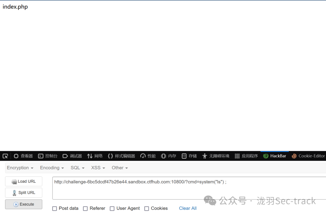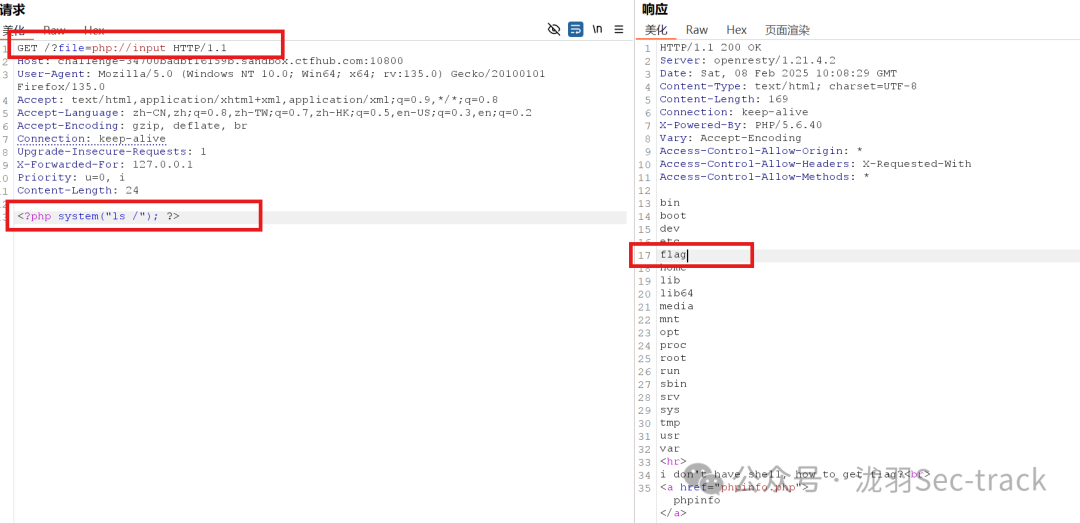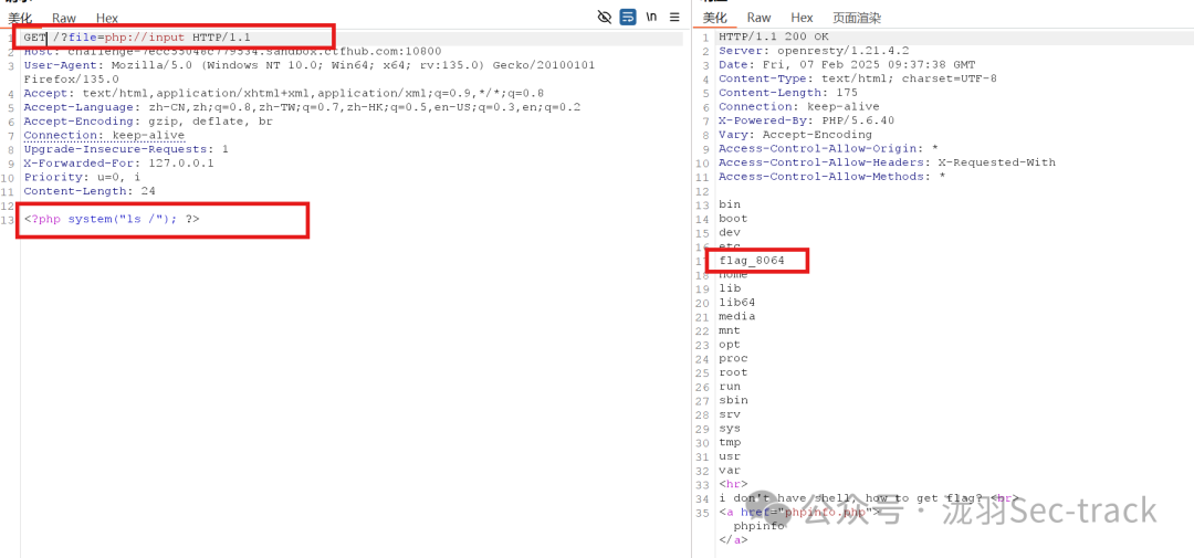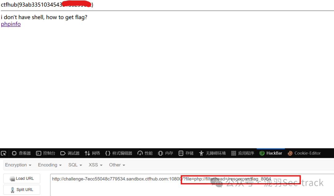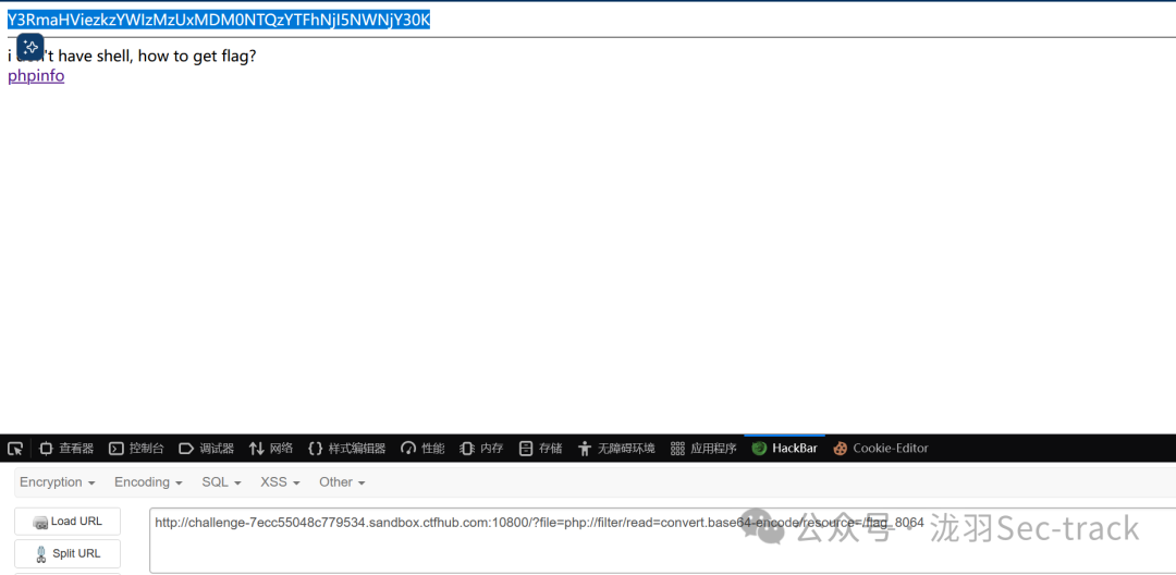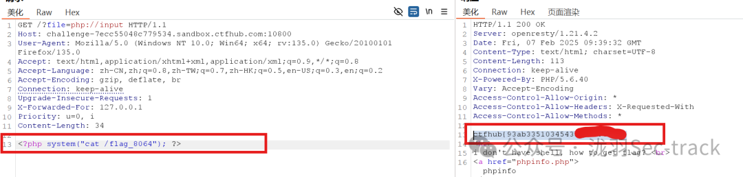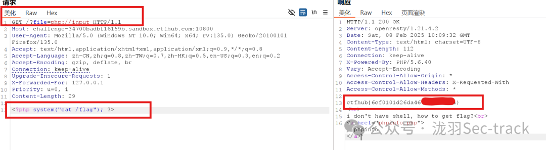 给了一个phpinfo()界面,根据题目提示,还是文件包含题,抓包利用php;//input