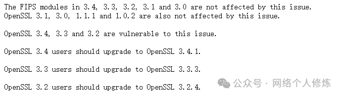 漏洞源于 OpenSSL 3.2 版本引入的 RPK 实现缺陷,后续版本(如 3.3 和 3.4)继承了此问题。