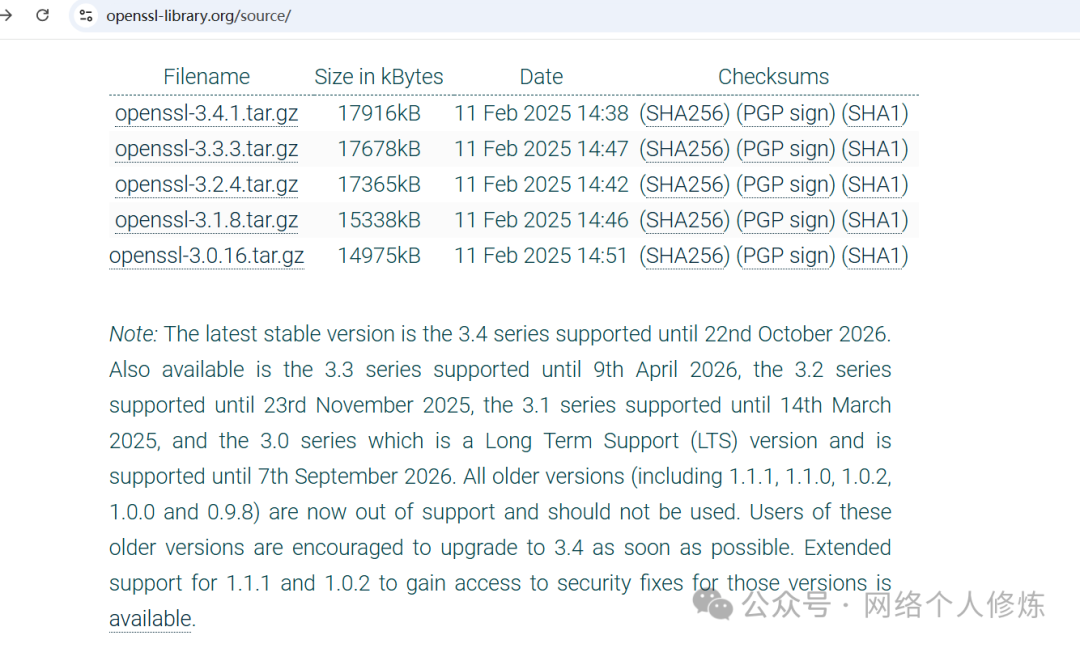 前往OpenSSL官方网站下载最新的稳定版(https://openssl-library.org/source/,或在后台回复“openssl”关键字获取)