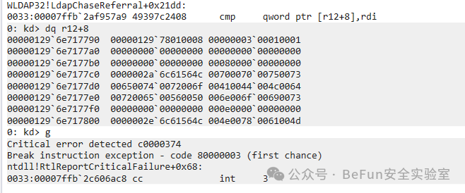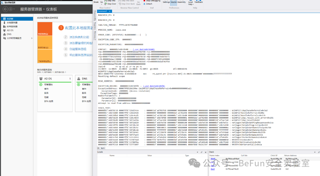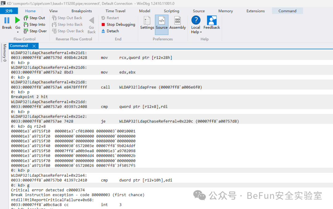 // 寻找lsass的EPROCESS!process 0 0 lsass.exe// 切换进程空间到lsass.process /i ffffd307f32c4080 ;g// 刷新kd维护的用户态加载模块列表使之匹配当前进程.reload /f /user// 设置断点bp /p @$proc netlogon!DsrGetDcNameEx2// 上面这个断下来之后再断下面的,不然断不到bp /p @$proc wldap32!LdapChaseReferral+0x21dd