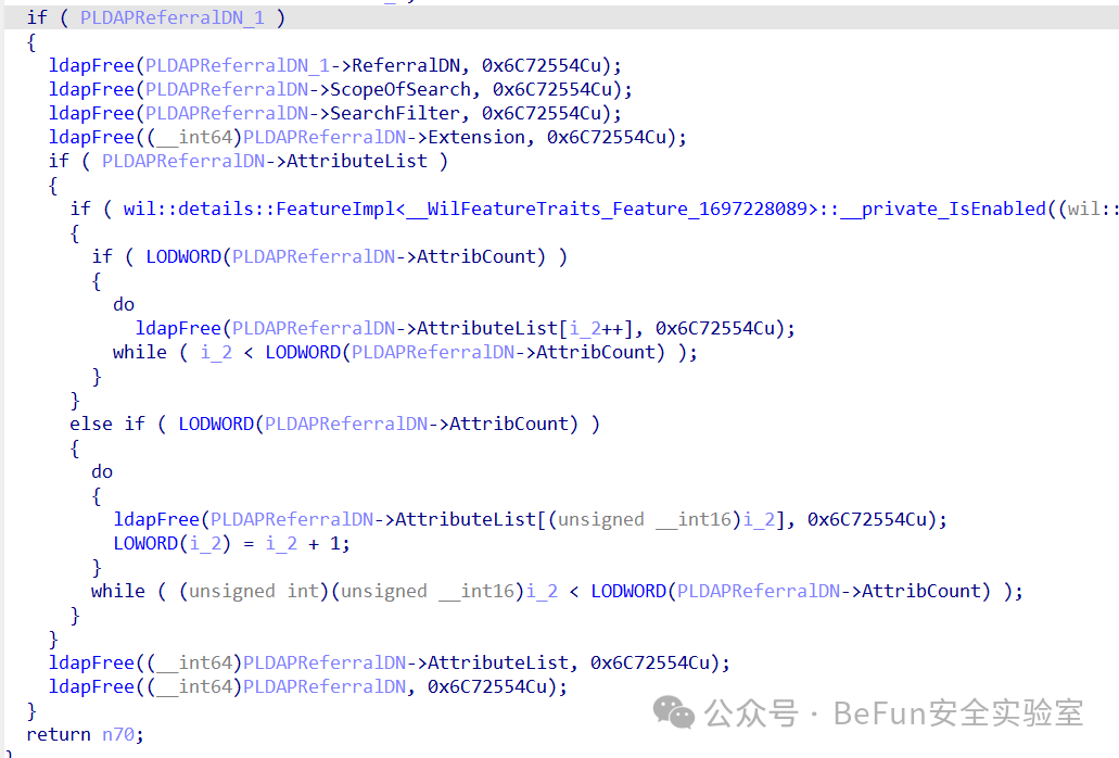 typedef struct _LDAPReferralDN{ PWCHAR ReferralDN; // DN present in the referral PWCHAR * AttributeList; // Attributes requested ULONG AttribCount; // Number of attributes requested ULONG ScopeOfSearch; // Search scope PWCHAR SearchFilter; // search filter PWCHAR Extension; // Extension part of the URL PWCHAR BindName; // A bindname extension for the URL} LDAPReferralDN, * PLDAPReferralDN;ULONG LdapChaseReferral(...){ ... LDAPReferralDN *pldapRefDN = NULL; ... USHORT i; ... if (pldapRefDN != NULL) { ldapFree(pldapRefDN->ReferralDN, LDAP_URL_SIGNATURE); ldapFree(pldapRefDN->SearchFilter, LDAP_URL_SIGNATURE); ldapFree(pldapRefDN->Extension, LDAP_URL_SIGNATURE); ldapFree(pldapRefDN->BindName, LDAP_URL_SIGNATURE); if (pldapRefDN->AttributeList) { for (i=0; i<pldapRefDN->AttribCount; i++) { ldapFree(pldapRefDN->AttributeList[i], LDAP_URL_SIGNATURE); } } ldapFree(pldapRefDN->AttributeList, LDAP_URL_SIGNATURE); ldapFree(pldapRefDN, LDAP_URL_SIGNATURE); } return hr;}