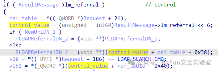 即这里的lm_referral是可以被用户控制的,在下面遇到未初始化的ref_table导致计算结果为非法地址触发崩溃:
