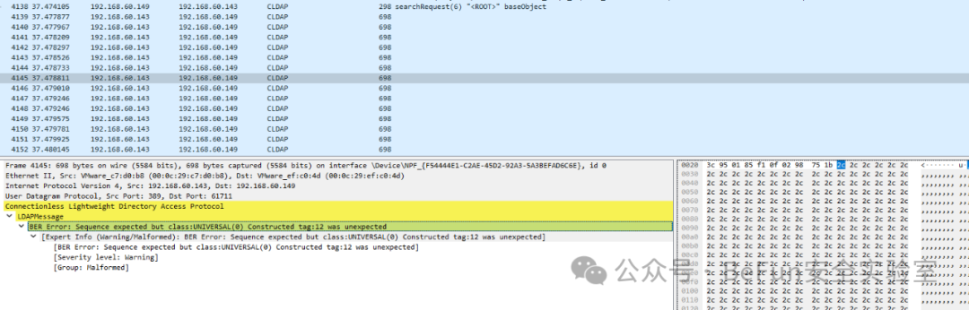 具体来说,他们找了一个神奇的RPC,可以让目标机器向我们控制的服务器发起一个LDAP请求,细节可以参考文章[2],然后我们的恶意服务器返回一个LDAP Search Result Done Referral响应,其中就包含了触发49113的lm_referral和触发49112的AttribCount。