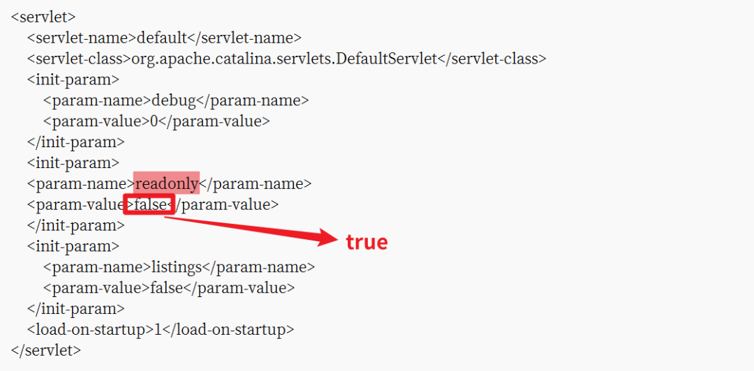 查看conf/web.xml的配置,检查readonly的参数是否为flase,如果不是就进行如下配置,注意是default servlet(大部分版本是要自己手动去添加这个参数,在漏洞版本中如果存在,基本