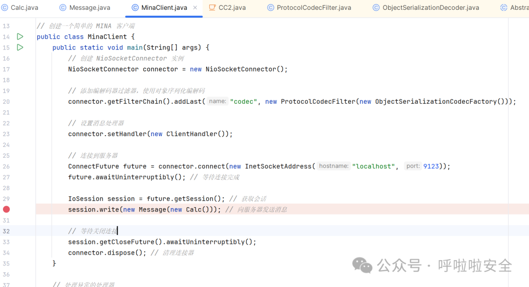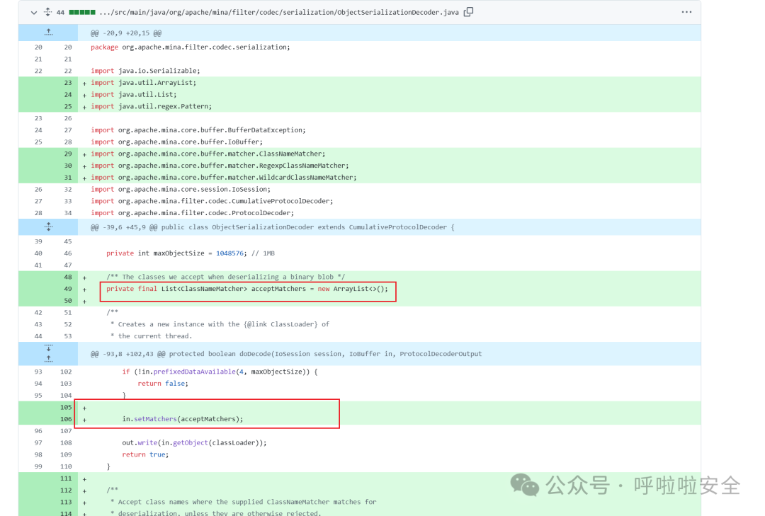 这句就是这个反序列化的核心,翻译过来的大概意思是:需要注意的是,使用 MINA 核心库的应用程序只有在调用 IoBuffer#getObject() 方法时才会受到影响,而这个特定方法在使用ObjectSerializationCodecFactory 类将实例添加到过滤器链时可能会被调用。如果您的应用程序特别使用这些类,则必须升级到最新版本的 MINA 核心库。了解Apache mina获取这个漏洞的基础信息后,需要了解一些Apache Mina的基础知识,这样才能简单的在本地搭建漏洞环境来复现漏洞并深入研究漏洞的代码成因。Apache Mina是一个能够帮助用户开发高性能和高伸缩性网络应用程序的框架。它通过Java nio技术基于TCP/IP和UDP/IP协议提供了抽象的、事件驱动的、异步的API。是用来代替NIO网络框架的,对NIO框架进行了一层封装的Socket库。Mina框架被分成了主要的3个组件部分: I/O Service,具体提供服务的组件。 I/O Filter Chain,过滤器链,用于支持各种切面服务。 I/O Handler,用于处理用户的业务逻辑。在 Apache MINA 的 I/O 过滤器链中,有多种处理数据的类和过滤器,每种都有其特定的功能和用途。以下是一些常见的处理数据的过滤器和类:1. 编解码器过滤器ProtocolCodecFilter:用于添加编解码器,支持将数据编码为字节流或从字节流解码为对象。常用的编解码器包括: TextLineCodecFactory:用于处理文本行的编解码。 ObjectSerializationCodecFactory:用于处理 Java 对象的序列化和 反序列化。 ByteArrayCodecFactory:用于处理字节数组的编解码。2. 日志过滤器LoggingFilter:用于记录传入和传出的数据,方便调试和监控。可以配置日志级别和输出格式。3. 异常处理过滤器ExceptionFilter:用于处理在数据处理过程中发生的异常,提供统一的异常处理机制。4. 计时器过滤器IdleStateFilter:用于检测空闲状态(如读取或写入空闲),可以帮助实现超时机制和连接管理。5. 身份验证过滤器SslFilter:用于在传输层提供 SSL/TLS 加密,确保数据的安全性。AuthenticationFilter:用于身份验证,可以与其他安全机制结合使用。6. 自定义过滤器开发者可以自定义过滤器,以满足特定需求。自定义过滤器可以实现任何需要的处理逻辑,如数据转换、验证等。了解了Apache mina的基础架构之后,我们通过公开的漏洞信息和了解的mina的大概架构,能够猜测到漏洞的位置就存在于架构的编解码器过滤器使用的ObjectSerializationCodecFactory类中,这个类也是mina专门用于处理Java 对象的序列化和反序列化的编解码器。搭建验证环境我们编写一个基础的 Apache MINA 实现示例,使用 ObjectSerializationCodecFactory 作为编解码器。在pom.xml中加入Apache MINA 的 Maven 依赖,符合漏洞版本即可“`