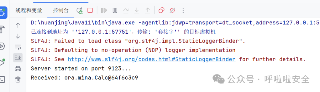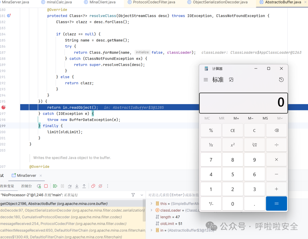 调试MinaServer并运行MinaClient,在运行到return in.readObject()后反序列化出咱们发送的calc类,执行了计算器命令