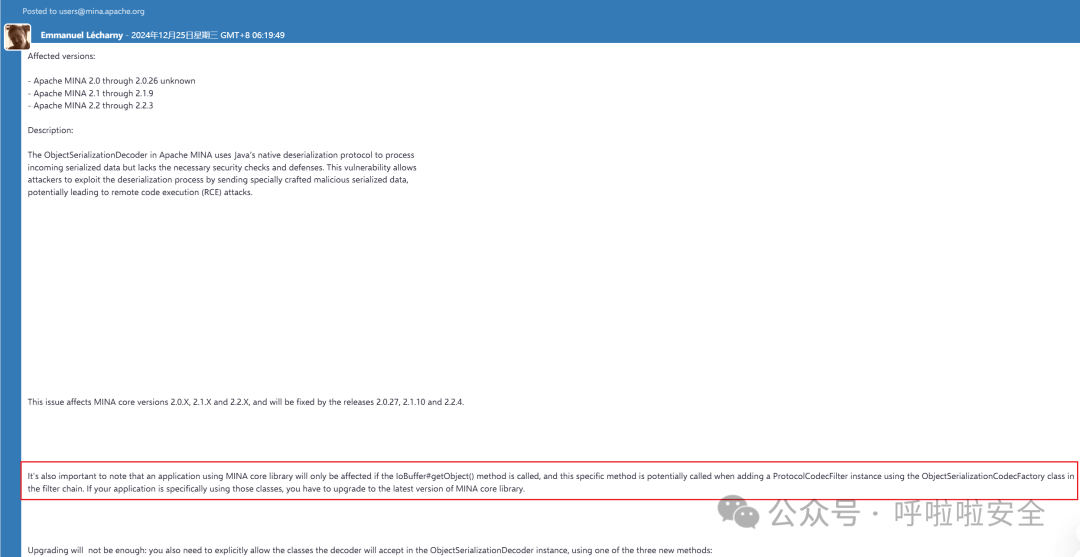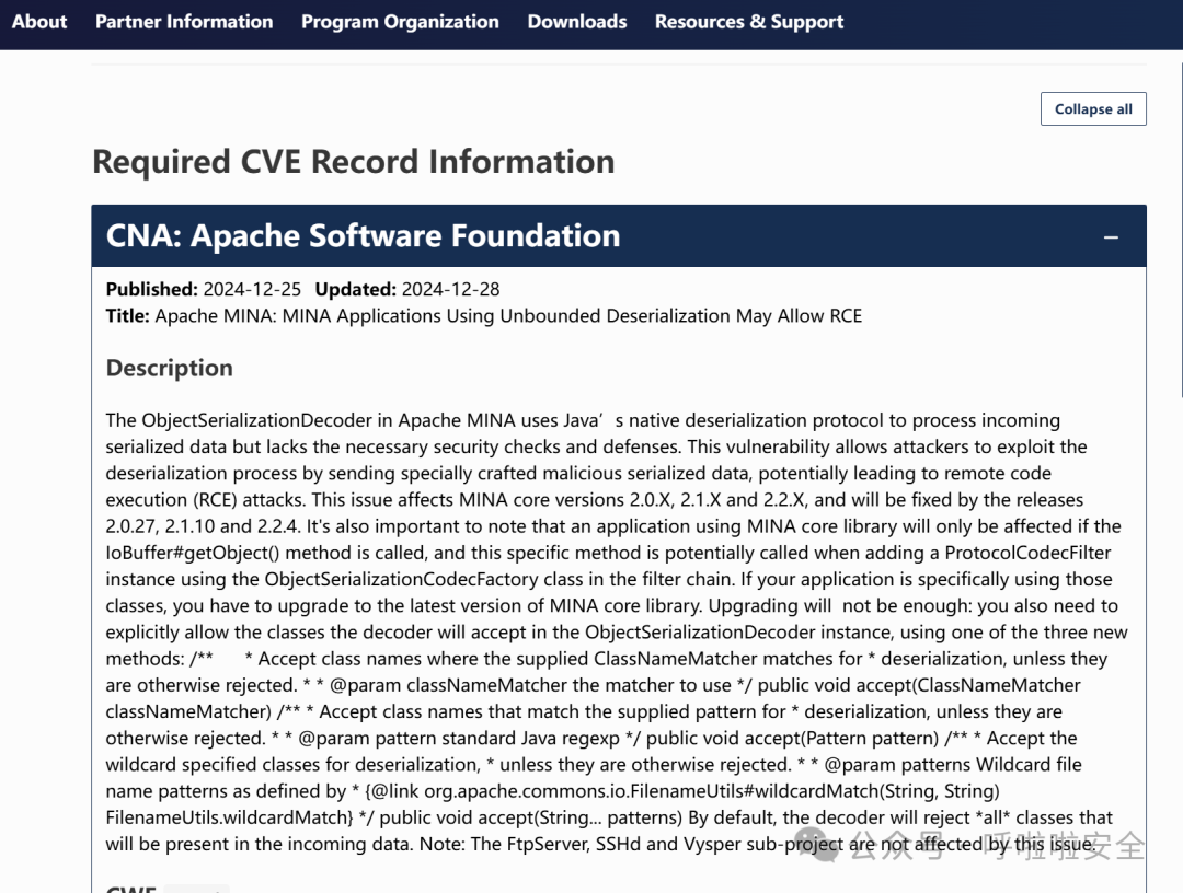前言最近披露了一个新的apache下属产品mina的CVE-2024-52046反序列化漏洞,这个产品mina之前没有接触过,好奇心驱使之下准备一下并记录一下学习的过程首先查看cve官网公开的部分漏洞信息https://www.cve.org/CVERecord?id=CVE-2024-52046