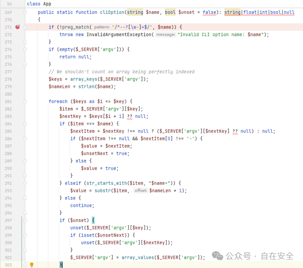 从命名来看,代码主要是想通过 cli 方式完成参数赋值,查看 App::cliOption 定义,参数值来自于 $_SERVER[‘argv’] :