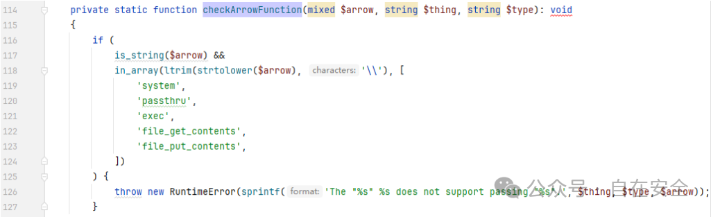 下面需要尝试实现 RCE 。通过分析发现,虽然\craft\web\twig\Extension::checkArrowFunction 中设置了黑名单检查,但是很容易利用 call_user_func 等进行绕过: