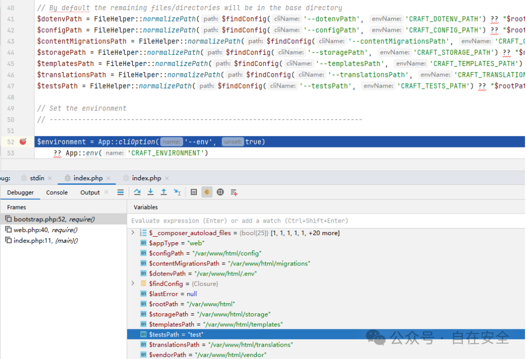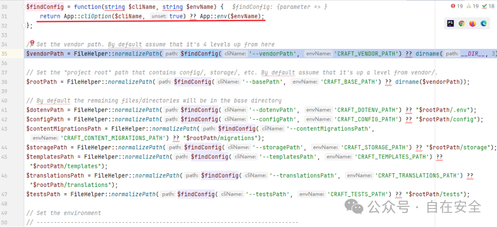 Craft CMS 在处理请求中会加载 vendor/craftcms/cms/bootstrap/bootstrap.php 文件,通过 findConfig 函数依次读取多个环境变量,包括 vendorPath/basePath/dotenvPath 等: