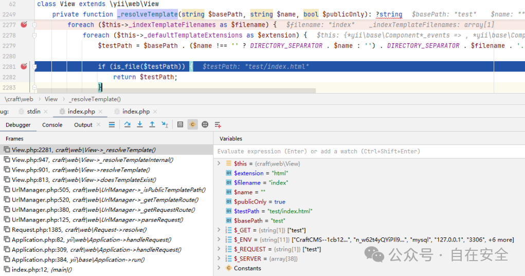 很明显这里存在变量覆盖的风险。注意到其中一个参数名为 templatesPath ,猜测和模板路径有关,因为 Craft CMS 集成了 Twig 模板,所以可以尝试通过覆盖模板内容来实现 SSTI 。Twig SSTI 漏洞其他的分析文章可以参考:CVE-2022-2073 Grav CMS Twig SSTI RCE 漏洞及最新版补丁绕过