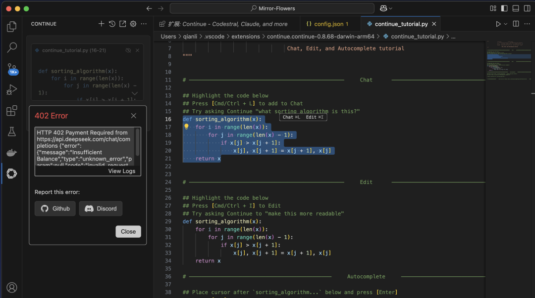 Continue给出了示例代码,可以看到如果购买了API套餐,则可以进行代码审计和优化询问(最近api充值貌似停止了,此处见谅哈)