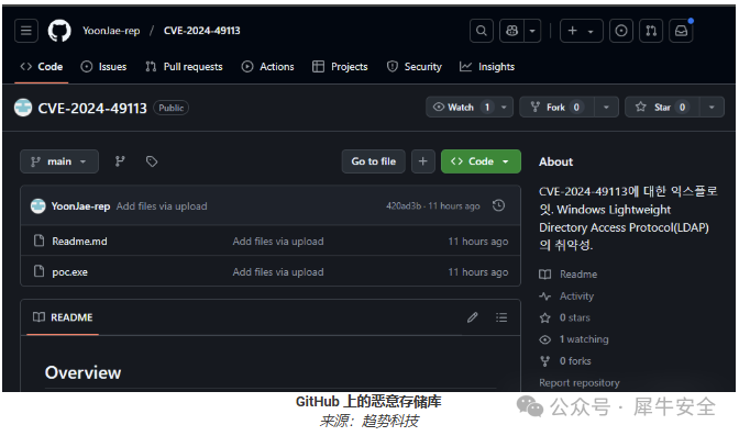 Trend Micro 报告称,恶意 GitHub 存储库包含一个项目,该项目似乎是从 SafeBreach Labs于 2025 年 1 月 1 日发布的 CVE-2024-49113合法 PoC分叉而来。