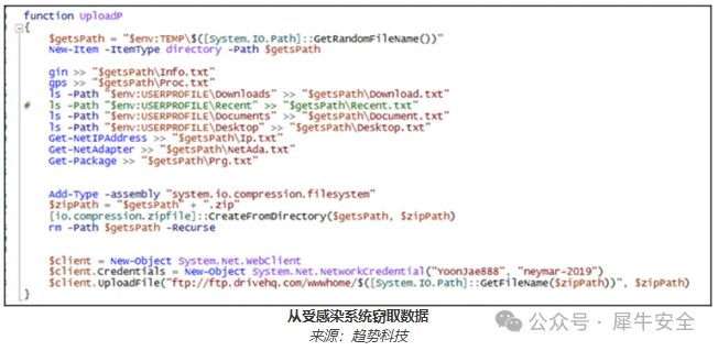 此最终有效载荷收集计算机信息、进程列表、目录列表、IP 地址和网络适配器信息以及已安装的更新,并使用硬编码凭据将它们以 ZIP 存档形式上传到外部 FTP 服务器。