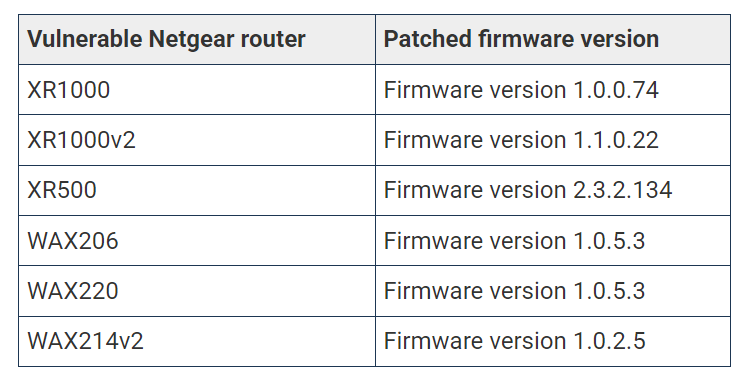 该公司在周末发布的报告中说道:“ Netgear强烈建议相关用户尽快下载最新的固件。”下表列出了所有弱势路由器模型和带有安全补丁的固件版本。