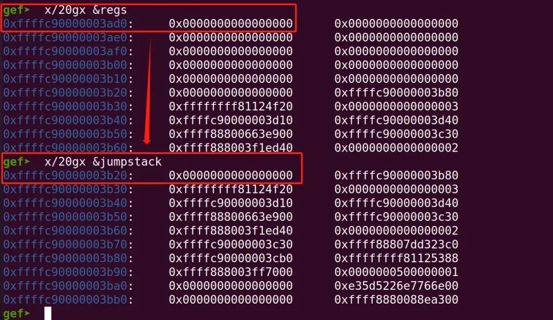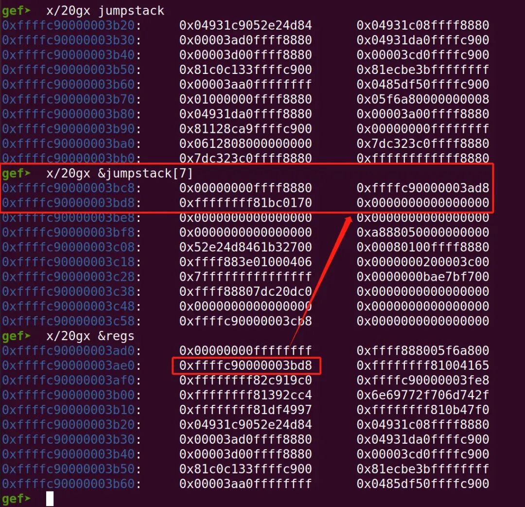 我们可以通过溢出regs变量覆盖到jumpstack变量。