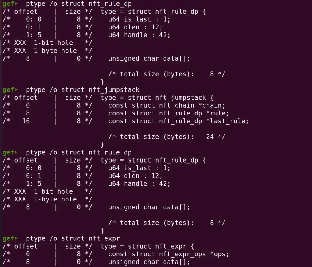 紧接着来看一下nft_rule_dp结构体,可以发现第一个八个字节是一些标志位组成的,而后续的八个字节则是用于存储nft_expr结构体的指针。