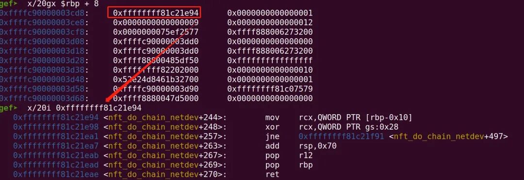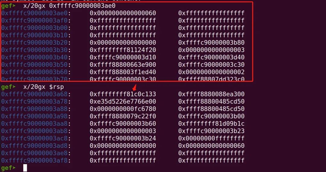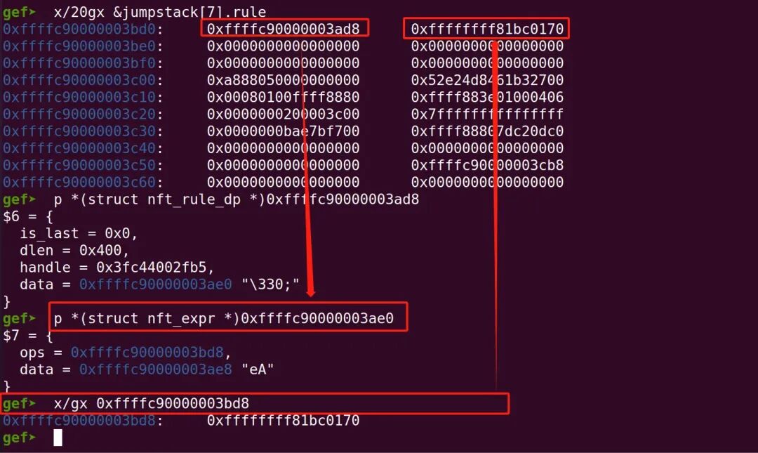 因此构造的流程如下,首先我们通过漏洞溢出到nft_jumpstack结构体,并且修改rule变量为可控内容的地址同时需要将lastrule的值篡改为比rule更大的值,原因上述已经说过。紧接着在可控内容中伪造一个nft_rule_dp结构体,第一个八字节是填充位,而第二个八字节是需要伪造的函数表指针,同样的我们也将该指针篡改为可控内容的地址,然后再该地址处伪造nft_expr,并且将ops变量指向我们想要执行的函数即可。