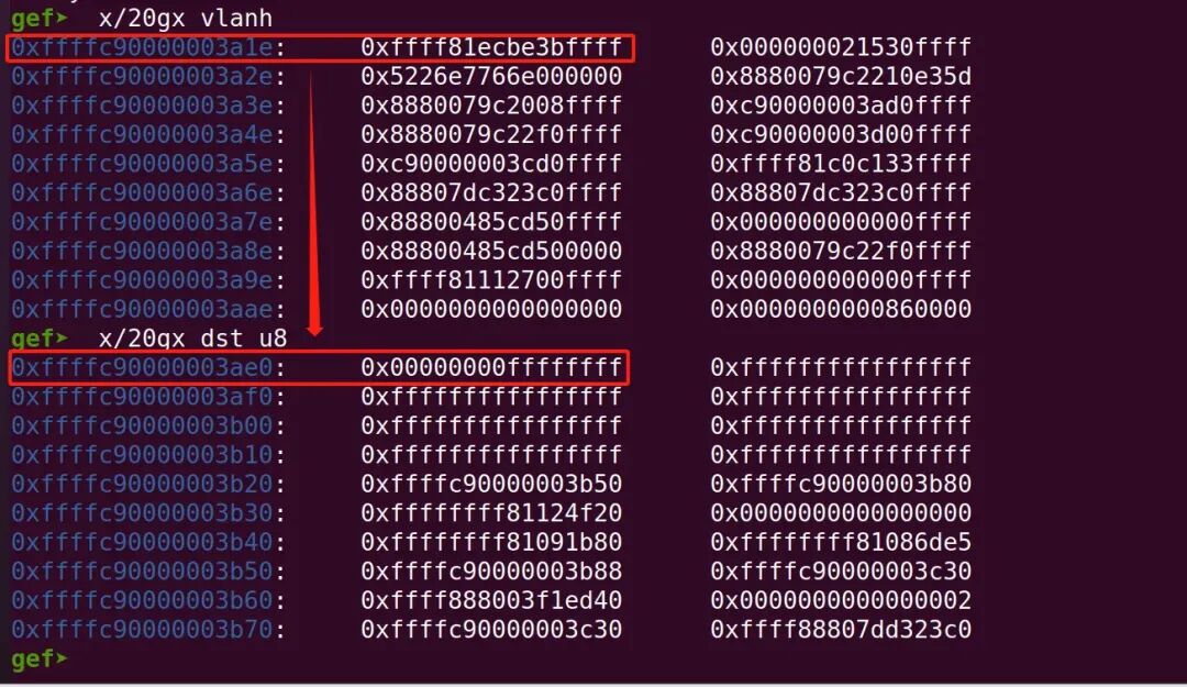 首先在nft_payload_copy_vlan函数中,漏洞点是将vlan头的数据拷贝到指定的寄存器里面,而vlan头的地址是低于寄存器的地址,这就会导致在拷贝完vlan头后会将寄存器中的值也进行拷贝的操作,而寄存器的值我们是能人为控制的,因此就可以完成伪造的操作。