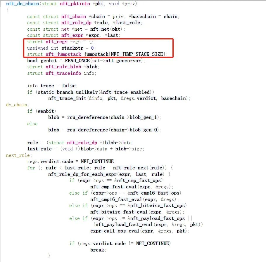 nft_jumpstack结构体在nft_do_chain函数的作用如下,当状态寄存器被设置为JUMP条件时,意味着需要跳转到其他chain进行处理,因此需要先保存当前chain的状态,这里与函数调用时保存栈时的处理一样,估计因此才命名为jumpstack。并且使用一个全局变量stackptr用于确定保存的chain的先后顺序。在保存完之后,就跳转到目的chain,目的chain则是存储在regs.verdict.chain中。