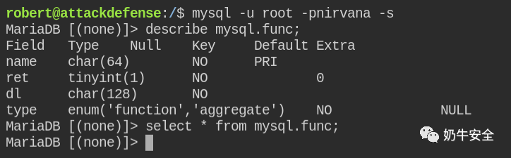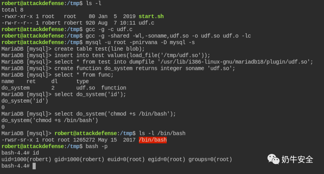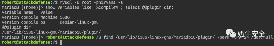 现在以 MySQL 的root用户身份登录并使用 load_file 和 dumpfile 将文件 /tmp/udf.so 复制到 @@plugin_dir