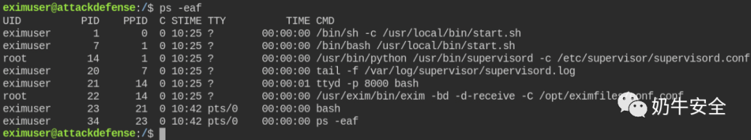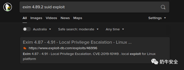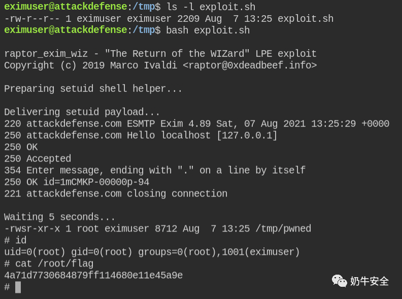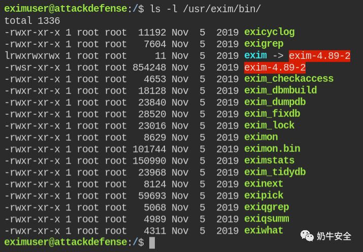 当列出 /usr/exim/bin 的内容时, 发现 Exim 版本是 4.89.2 并且可执行文件设置了 suid 位